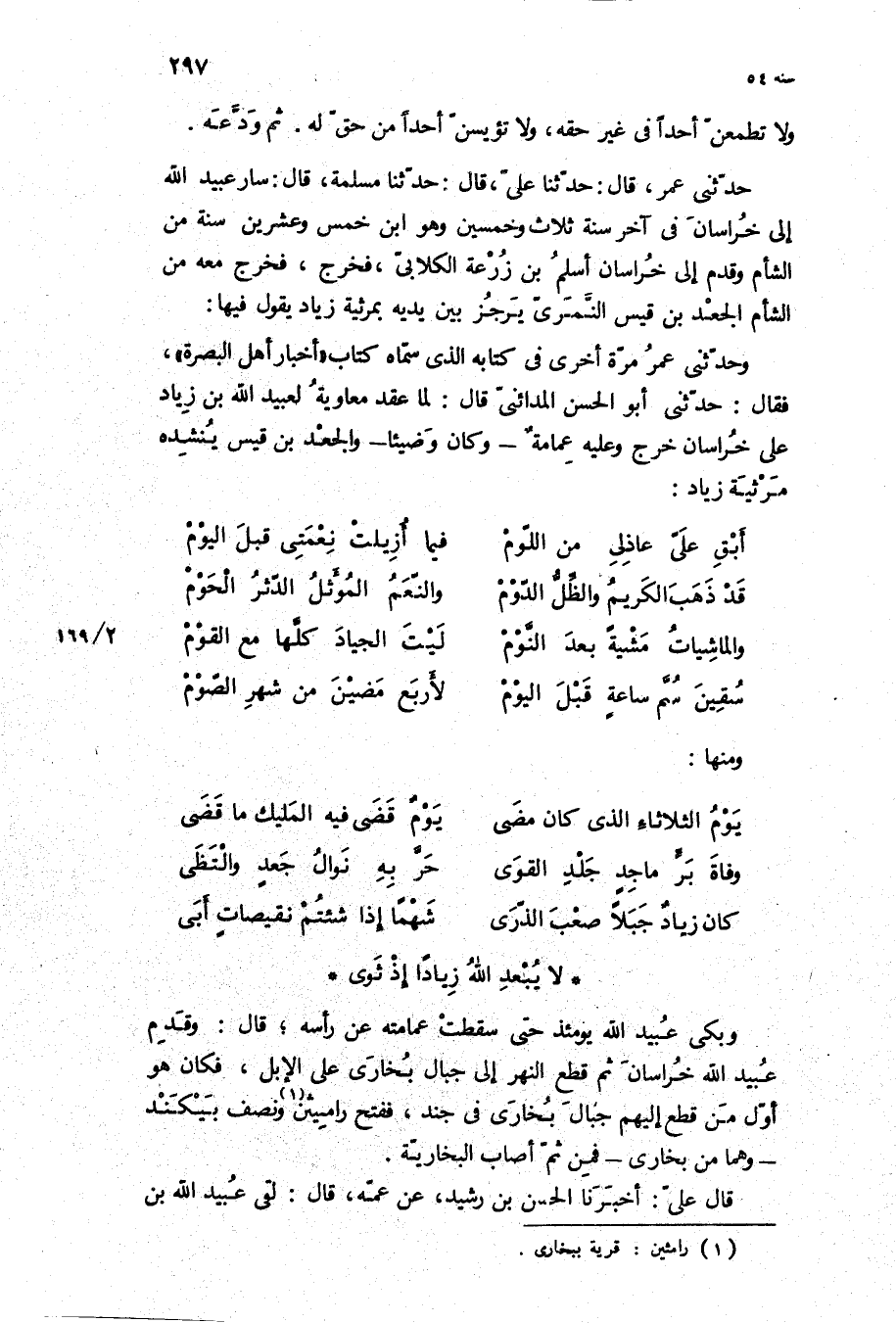 حَدَّثَنِي عُمَرُ، قَالَ: حَدَّثَنَا عَلِيٌّ، قَالَ: حَدَّثَنَا مسلمة، قَالَ: سار عُبَيْد اللَّهِ إِلَى خُرَاسَان فِي آخر سنة ثلاث وخمسين وَهُوَ ابن خمس وعشرين سنة من الشام وقدم إِلَى خراسان اسلم بن زرعه الكلابى، فخرج، فخرج مَعَهُ من الشام الجعد بن قيس النمري يرجز بين يديه بمرثية زياد يقول فِيهَا: