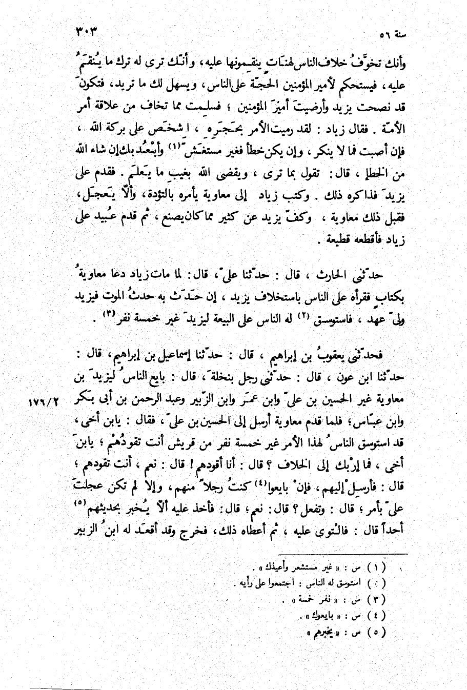 حَدَّثَنَا ابن عون، قَالَ: حَدَّثَنِي رجل بنخلة، قَالَ: بايع الناس ليزيد بن مُعَاوِيَة غير الْحُسَيْن بن علي وابن عمر وابن الزُّبَيْر وعبد الرَّحْمَن بن أبي بكر وابن عباس، فلما قدم مُعَاوِيَة ارسل الى الحسين بن على، فقال: يا بن أخي، قد استوسق الناس لهذا الأمر غير خمسة نفر من قريش أنت تقودهم، يا بن أخي، فما إربك إِلَى الخلاف؟ قَالَ: أنا أقودهم! قَالَ: نعم، أنت تقودهم، قَالَ: فأرسل إِلَيْهِم، فإن بايعوا كنت رجلا مِنْهُمْ، وإلا لم تكن عجلت علي بأمر، قَالَ: وتفعل؟ قال: نعم، قال: فاخذ عليه الا يخبر بحديثهم أحدا قَالَ: فالتوى عَلَيْهِ، ثُمَّ أعطاه ذَلِكَ، فخرج وَقَدْ أقعد لَهُ ابن الزبير