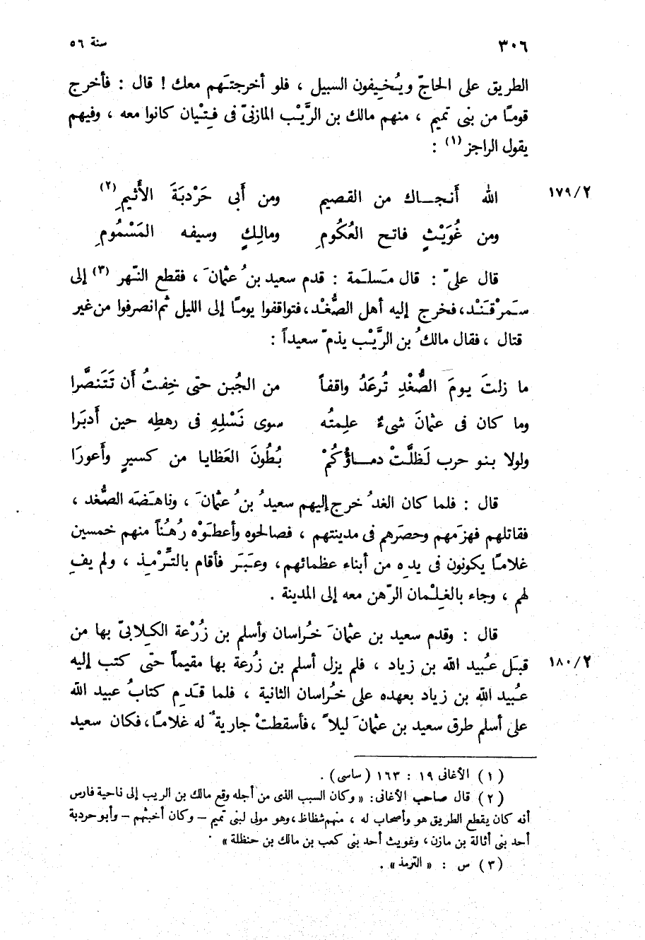 قَالَ علي: قَالَ مسلمة: قدم سَعِيد بن عُثْمَانَ، فقطع النهر إِلَى سمرقند، فخرج إِلَيْهِ أهل الصغد، فتواقفوا يَوْمًا إِلَى الليل ثُمَّ انصرفوا مِنْ غَيْرِ قتال، فَقَالَ مالك بن الريب يذم سعيدا: