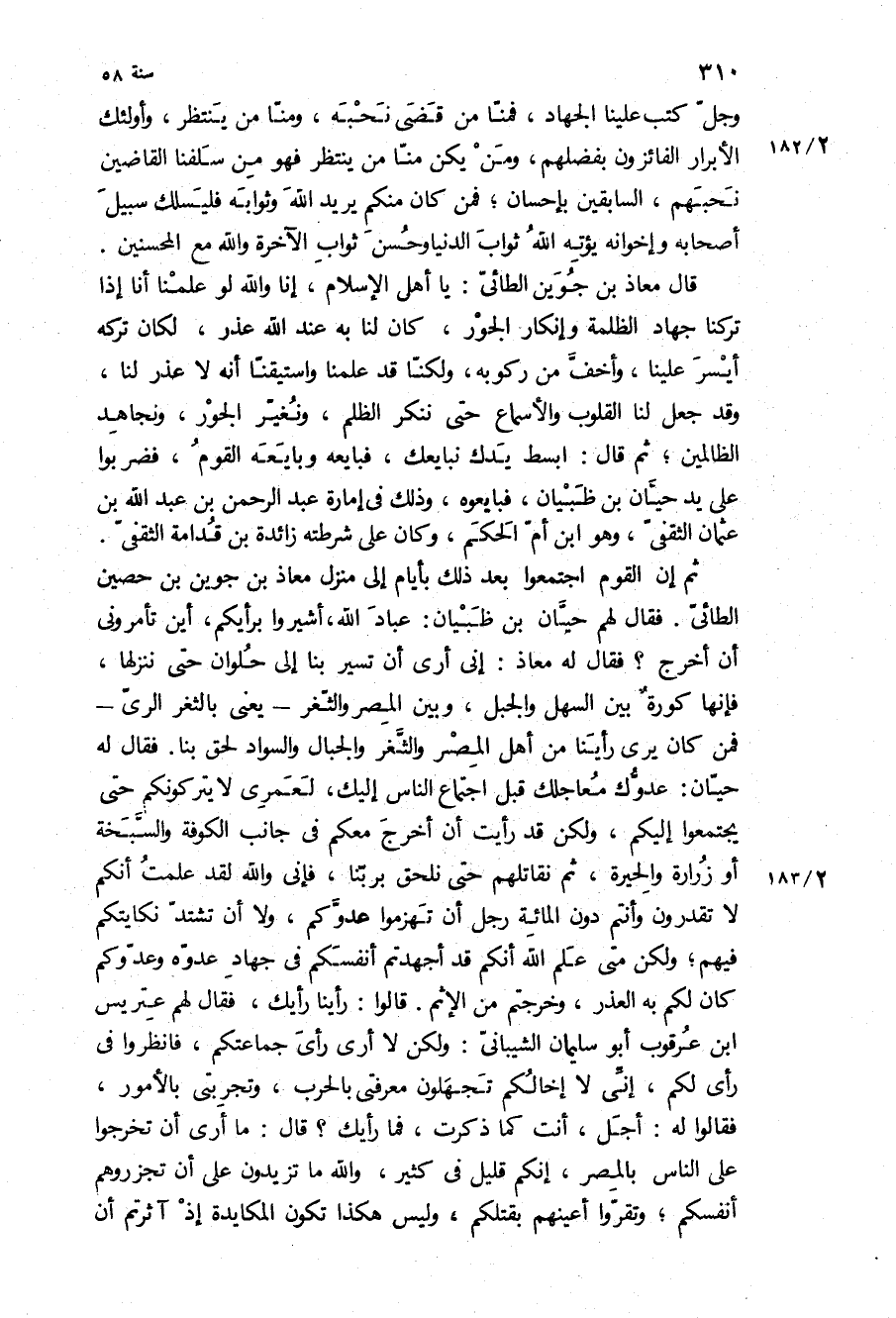ثُمَّ إن القوم اجتمعوا بعد ذَلِكَ بأيام إِلَى منزل معاذ بن جوين بن حصين الطَّائِيّ فَقَالَ لَهُمْ حيان بن ظبيان: عباد اللَّه، أشيروا برأيكم، أين تأمروني أن أخرج؟ فَقَالَ لَهُ معاذ: إني أَرَى أن تسير بنا إِلَى حلوان حَتَّى ننزلها، فإنها كورة بين السهل والجبل، وبين المصر والثغر- يعني بالثغر الري- فمن كَانَ يرى رأينا من أهل المصر والثغر والجبال والسواد لحق بنا فَقَالَ لَهُ حيان: عدوك معاجلك قبل اجتماع الناس إليك، لعمري لا يتركونكم حَتَّى يجتمعوا إليكم، ولكن قَدْ رأيت أن أخرج معكم فِي جانب الْكُوفَة والسبخة أو زرارة والحيرة، ثُمَّ نقاتلهم حَتَّى نلحق بربنا، فإني وَاللَّهِ لقد علمت أنكم لا تقدرون وَأَنْتُمْ دون المائة رجل أن تهزموا عدوكم، ولا ان تشتد نكايتكم فِيهِمْ، ولكن متى علم اللَّه أنكم قَدْ أجهدتم أنفسكم فِي جهاد عدوه وعدوكم كَانَ لكم بِهِ العذر، وخرجتم من الإثم قالوا: رأينا رأيك، فقال لهم عتريس ابن عرقوب أَبُو سُلَيْمَان الشيباني: ولكن لا أَرَى راى جماعتكم، فانظروا في راى لكم، إني لا إخالكم تجهلون معرفتي بالحرب، وتجربتي بالأمور، فَقَالُوا لَهُ: أجل، أنت كما ذكرت، فما رأيك؟ قَالَ: مَا أَرَى أن تخرجوا عَلَى الناس بالمصر، إنكم قليل فِي كثير، وَاللَّهِ مَا تزَيْدون عَلَى أن تجزروهم أنفسكم، وتقروا أعينهم بقتلكم، وليس هكذا تكون المكايدة إذ آثرتم أن