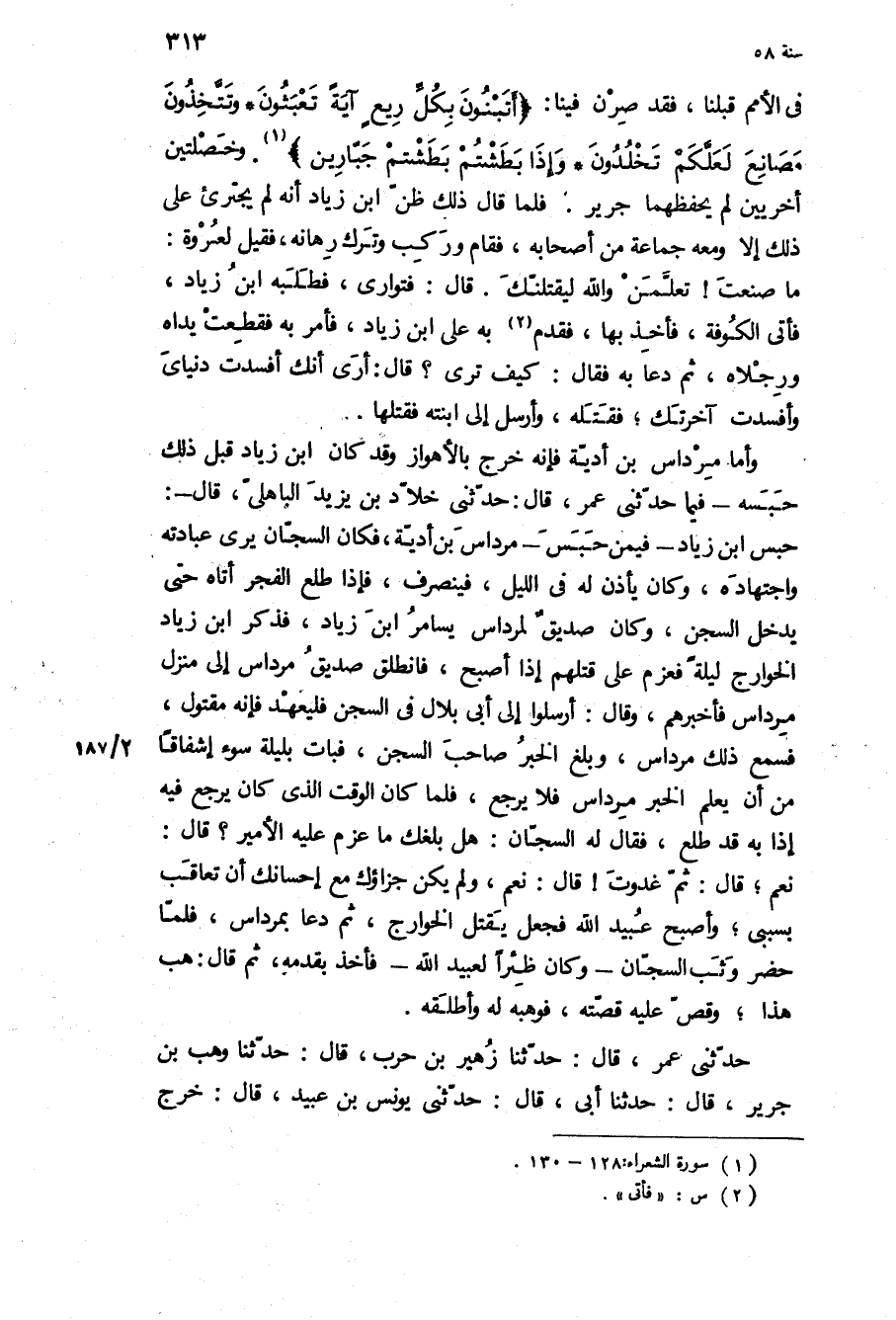 فِي الأُمَمِ قَبْلَنَا، فَقَدْ صِرْنَ فِينَا: «أَتَبْنُونَ بِكُلِّ رِيعٍ آيَةً تَعْبَثُونَ وَتَتَّخِذُونَ مَصانِعَ لَعَلَّكُمْ تَخْلُدُونَ وَإِذا بَطَشْتُمْ بَطَشْتُمْ جَبَّارِينَ» وَخَصْلَتَيْنِ أُخْرَيَيْنِ لَمْ يَحْفَظْهُمَا جَرِيرٌ فَلَمَّا قَالَ ذَلِكَ ظَنَّ ابْنُ زِيَادٍ أَنَّهُ لَمْ يَجْتَرِئْ عَلَى ذَلِكَ إِلا وَمَعَهُ جَمَاعَةٌ مِنْ أَصْحَابِهِ، فَقَامَ وَرَكِبَ وَتَرَكَ رِهَانَهُ، فَقِيلَ لِعُرْوَةَ: