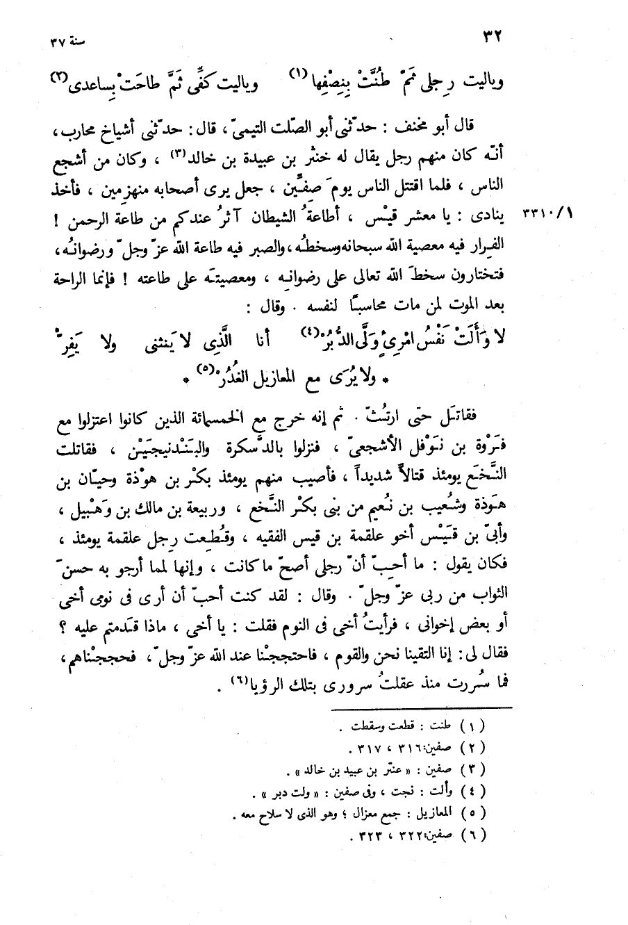 قَالَ أَبُو مخنف: حَدَّثَنِي أَبُو الصلت التيمي، قَالَ: حَدَّثَنِي أشياخ محارب أنه كَانَ مِنْهُمْ رجل يقال لَهُ خنثر بن عبيدة بن خَالِدٍ، وَكَانَ من أشجع الناس، فلما اقتتل الناس يوم صفين، جعل يرى أَصْحَابه منهزمين، فأخذ ينادي: يَا معشر قيس، أطاعة الشَّيْطَان آثر عندكم من طاعة الرحمن! الفرار فِيهِ معصية اللَّه سُبْحَانَهُ وسخطه، والصبر فِيهِ طاعة اللَّه عَزَّ وَجَلَّ ورضوانه، فتختارون سخط اللَّه تعالى عَلَى رضوانه، ومعصيته عَلَى طاعته! فإنما الراحة بعد الموت لمن مات محاسبا لنفسه وقال: