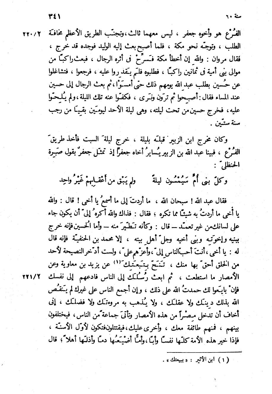 فَقَالَ عَبْد اللَّهِ! سبحان اللَّه، مَا أردت إِلَى مَا أسمع يَا أخي! قَالَ: وَاللَّهِ يَا أخي مَا أردت بِهِ شَيْئًا مما تكره، فَقَالَ: فذاك وَاللَّهِ أكره إلي أن يكون جَاءَ عَلَى لسانك مِنْ غَيْرِ تعمد- قَالَ: وكأنه تطير مِنْهُ- وأما الْحُسَيْن فإنه خرج ببنيه وإخوته وبني أخيه وجل اهل بيته، الا محمد بن الحنفية فإنه قَالَ لَهُ: يَا أخي، أنت أحب الناس إلي، وأعزهم علي، ولست أدخر النصيحة لأحد من الخلق أحق بِهَا مِنْكَ، تنح بتبعتك عن يَزِيد بن مُعَاوِيَة وعن الأمصار مَا استطعت، ثُمَّ ابعث رسلك إِلَى النَّاسِ فادعهم إِلَى نفسك فإن بايعوا لك حمدت اللَّه عَلَى ذَلِكَ، وإن أجمع الناس عَلَى غيرك لم ينقص اللَّه بِذَلِكَ دينك وَلا عقلك، وَلا يذهب بِهِ مروءتك وَلا فضلك، إني أخاف أن تدخل مصرا من هَذِهِ الأمصار وتأتي جماعة مِنَ النَّاسِ، فيختلفون بينهم، فمنهم طائفة معك، وأخرى عَلَيْك، فيقتتلون فتكون لأول الأسنة، فإذا خير هَذِهِ الأمة كلها نفسا وأبا، وأما أضيعها دما وأذلها أهلا، قَالَ