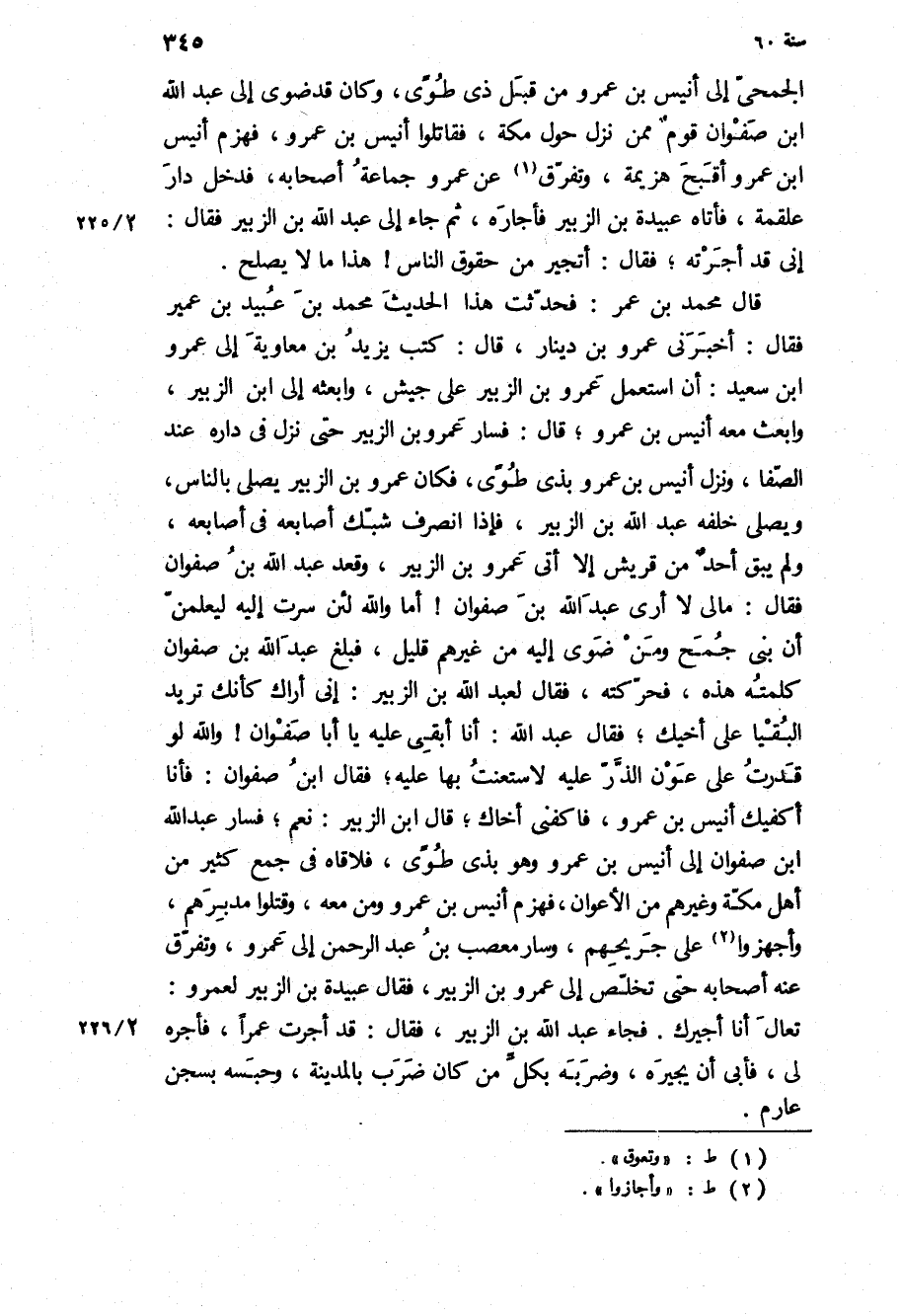 قَالَ مُحَمَّد بن عُمَرَ: فحدثت هَذَا الحديث مُحَمَّد بن عبيد بن عمير فَقَالَ: أَخْبَرَنِي عَمْرو بن دينار، قَالَ: كتب يَزِيد بن مُعَاوِيَة إِلَى عَمْرو ابن سَعِيد: أن استعمل عَمْرو بن الزُّبَيْرِ عَلَى جيش، وابعثه إِلَى ابن الزُّبَيْر، وابعث مَعَهُ أنيس بن عَمْرو، قَالَ: فسار عَمْرو بن الزُّبَيْرِ حَتَّى نزل فِي داره عِنْدَ الصفا، ونزل أنيس بن عَمْرو بذي طوى، فكان عَمْرو بن الزُّبَيْرِ يصلي بِالنَّاسِ، ويصلي خلفه عَبْد اللَّهِ بن الزُّبَيْرِ، فإذا انصرف شبك أصابعه فِي أصابعه، ولم يبق أحد من قريش إلا أتى عَمْرو بن الزُّبَيْرِ، وقعد عَبْد اللَّهِ بن صفوان فَقَالَ: ما لي لا أَرَى عَبْد اللَّهِ بن صفوان! أما وَاللَّهِ لَئِنْ سرت إِلَيْهِ ليعلمن أن بني جمح ومن ضوى إِلَيْهِ من غيرهم قليل، فبلغ عَبْد اللَّهِ بن صفوان كلمته هَذِهِ، فحركته، فَقَالَ لعبد اللَّه بن الزُّبَيْرِ: إني أراك كأنك تريد البقيا عَلَى أخيك، فَقَالَ عبد الله: أنا أبقي عَلَيْهِ يَا أَبَا صفوان! وَاللَّهِ لو قدرت عَلَى عون الذر عَلَيْهِ لاستعنت بِهَا عَلَيْهِ، فَقَالَ ابن صفوان: فأنا أكفيك أنيس بن عَمْرو، فاكفني أخاك، قَالَ ابن الزُّبَيْر: نعم، فسار عَبْد اللَّهِ ابن صفوان إِلَى أنيس بن عَمْرو وَهُوَ بذي طوى، فلاقاه فِي جمع كثير من أهل مكة وغيرهم من الأعوان، فهزم أنيس بن عمرو ومن معه، وقتلوا مدبرهم، واجهزوا على جريحهم، وسار معصب بن عَبْدِ الرَّحْمَنِ إِلَى عَمْرو، وتفرق عنه أَصْحَابه حَتَّى تخلص إِلَى عَمْرو بن الزُّبَيْرِ، فَقَالَ عبيدة بن الزُّبَيْرِ لعمرو: