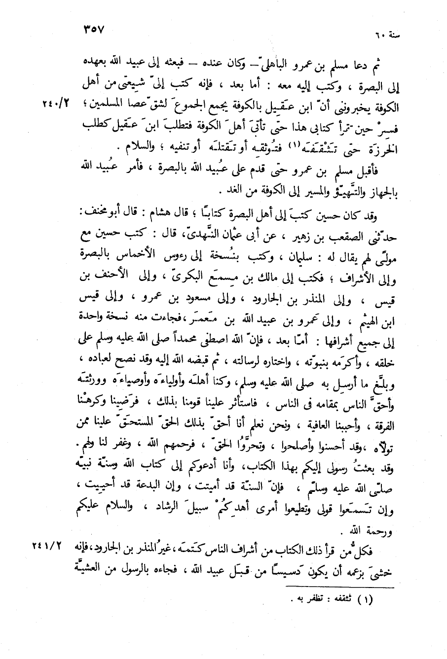 حَدَّثَنِي الصقعب بن زهير، عن أبي عُثْمَان النهدي، قَالَ: كتب حُسَيْن مع مولى لَهُمْ يقال لَهُ: سُلَيْمَان، وكتب بنسخة إِلَى رءوس الأخماس بِالْبَصْرَةِ وإلى الأشراف، فكتب إِلَى مالك بن مسمع البكري، وإلى الأحنف بن قيس، وإلى المنذر بن الجارود، وإلى مسعود بن عَمْرو، والى قيس ابن الهيثم، والى عمرو بن عُبَيْد اللَّهِ بن معمر، فجاءت مِنْهُ نسخة واحدة إِلَى جميع أشرافها: أَمَّا بَعْدُ، فان الله اصطفى محمدا ص عَلَى خلقه، وأكرمه بنبوته، واختاره لرسالته، ثُمَّ قبضه اللَّه إِلَيْهِ وَقَدْ نصح لعباده، وبلغ ما ارسل به ص، وكنا أهله وأولياءه وأوصياءه وورثته وأحق الناس بمقامه فِي الناس، فاستأثر علينا قومنا بِذَلِكَ، فرضينا وكرهنا الفرقة، وأحببنا العافية، ونحن نعلم أنا أحق بِذَلِكَ الحق المستحق علينا ممن تولاه، وَقَدْ أحسنوا وأصلحوا، وتحروا الحق، فرحمهم اللَّه، وغفر لنا ولهم.