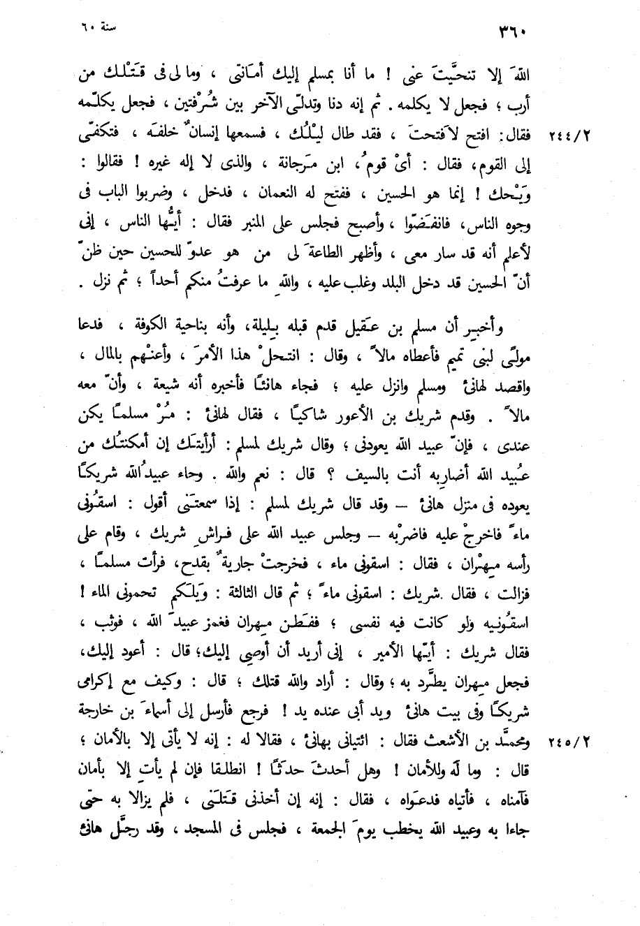 ويحك! إنما هُوَ الْحُسَيْن، ففتح لَهُ النُّعْمَان، فدخل، وضربوا الباب فِي وجوه الناس، فانفضوا، وأصبح فجلس عَلَى الْمِنْبَر فَقَالَ: أَيُّهَا النَّاسُ، إني لأعلم أنه قَدْ سار معي، وأظهر الطاعة لي من هُوَ عدو للحسين حين ظن أن الْحُسَيْن قد دخل البلد وغلب عليه، والله مَا عرفت مِنْكُمْ أحدا، ثُمَّ نزل وأخبر أن مسلم بن عقيل قدم قبله بليلة، وأنه بناحية الْكُوفَة، فدعا مولى لبني تميم فأعطاه مالا، وَقَالَ: انتحل هَذَا الأمر، وأعنهم بالمال، واقصد لهانئ ومسلم وانزل عَلَيْهِ، فَجَاءَ هانئا فأخبره أنه شيعة، وأن مَعَهُ مالا وقدم شريك بن الأعور شاكيا، فَقَالَ لهانئ: مر مسلما يكن عندي، فإن عُبَيْد اللَّهِ يعودني، وَقَالَ شريك لمسلم: أرأيتك إن أمكنتك من عُبَيْد اللَّهِ أضاربه أنت بالسيف؟ قَالَ: نعم وَاللَّهِ وجاء عُبَيْد اللَّهِ شريكا يعوده فِي منزل هانئ- وَقَدْ قَالَ شريك لمسلم: إذا سمعتني أقول: اسقوني ماء فاخرج عَلَيْهِ فاضربه- وجلس عُبَيْد اللَّهِ عَلَى فراش شريك، وقام عَلَى رأسه مهران، فَقَالَ: اسقوني ماء، فخرجت جارية بقدح، فرأت مسلما، فزالت، فَقَالَ شريك: اسقوني ماء، ثُمَّ قَالَ الثالثة: ويلكم تحموني الماء! اسقونيه ولو كَانَتْ فِيهِ نفسي، ففطن مهران فغمز عُبَيْد اللَّهِ، فوثب، فَقَالَ شريك: أيها الأمير، إني أريد أن أوصي إليك، قَالَ: أعود إليك، فجعل مهران يطرد بِهِ، وَقَالَ: أراد وَاللَّهِ قتلك، قَالَ: وكيف مع إكرامي شريكا وفي بيت هانئ ويد أبي عنده يد! فرجع فأرسل إِلَى أسماء بن خارجة ومُحَمَّد بن الأشعث فَقَالَ: ائتياني بهانىء، فقالا لَهُ: إنه لا يأتي إلا بالأمان، قَالَ: وما لَهُ وللأمان! وهل أحدث حدثا! انطلقا فإن لم يأت إلا بأمان فآمناه، فأتياه فدعواه، فَقَالَ: إنه إن أخذني قتلني، فلم يزالا بِهِ حَتَّى جاءا بِهِ وعبيد اللَّه يخطب يوم الجمعة، فجلس فِي المسجد، وَقَدْ رجل هانئ