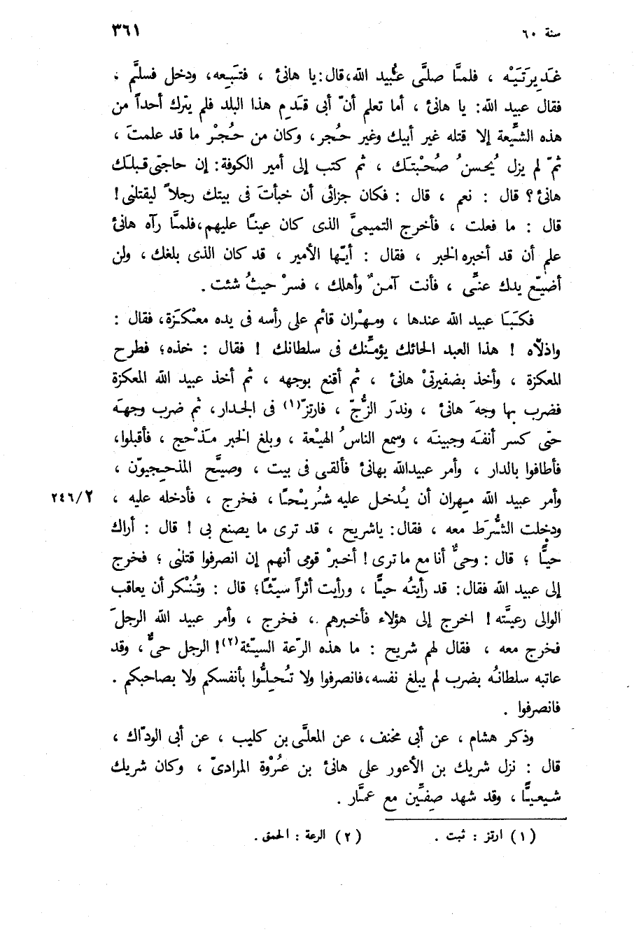 وا ذلاه! هَذَا العبد الحائك يؤمنك فِي سلطانك! فَقَالَ: خذه، فطرح المعكزة، وأخذ بضفيرتي هانئ، ثُمَّ أقنع بوجهه، ثُمَّ أخذ عُبَيْد اللَّهِ المعكزة فضرب بِهَا وجه هانئ، وندر الزج، فارتز فِي الجدار، ثُمَّ ضرب وجهه حَتَّى كسر أنفه وجبينه، وسمع الناس الهيعة، وبلغ الخبر مذحج، فأقبلوا، فأطافوا بالدار، وأمر عُبَيْد اللَّهِ بهانىء فألقي فِي بيت، وصيح المذحجيون، وأمر عُبَيْد اللَّهِ مهران أن يدخل عَلَيْهِ شريحا، فخرج، فأدخله عَلَيْهِ، ودخلت الشرط مَعَهُ، فَقَالَ: يَا شريح، قَدْ ترى مَا يصنع بي! قَالَ: أراك حيا، قَالَ: وحي أنا مع مَا ترى! أخبر قومي أَنَّهُمْ إن انصرفوا قتلني، فخرج إِلَى عُبَيْد اللَّهِ فَقَالَ: قَدْ رأيته حيا، ورأيت أثرا سيئا، قَالَ: وتنكر أن يعاقب الوالي رعيته! اخرج إِلَى هَؤُلاءِ فأخبرهم، فخرج، وأمر عُبَيْد اللَّهِ الرجل فخرج مَعَهُ، فَقَالَ لَهُمْ شريح: مَا هَذِهِ الرعة السيئة! الرجل حي، وَقَدْ عاتبه سلطانه بضرب لم يبلغ نفسه، فانصرفوا وَلا تحلوا بأنفسكم وَلا بصاحبكم.