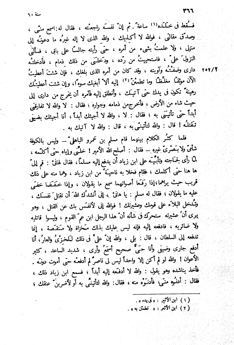 فلما كثر الكلام بينهما قام مسلم بن عَمْرو الباهلي- وليس بالكوفة شامي وَلا بصري غيره- فَقَالَ: أصلح اللَّه الأمير! خلني وإياه حَتَّى أكلمه، لما رَأَى لجاجته وتأبيه عَلَى ابن زياد أن يدفع إِلَيْهِ مسلما، فَقَالَ لهانئ: قم الى هاهنا حَتَّى أكلمك، فقام فخلا بِهِ ناحية من ابن زياد، وهما مِنْهُ عَلَى ذَلِكَ قريب حَيْثُ يراهما، إذا رفعا أصواتهما سمع مَا يقولان، وإذا خفضا خفي عَلَيْهِ مَا يقولان، فَقَالَ لَهُ مسلم: يَا هانئ، إني أنشدك اللَّه أن تقتل نفسك، وتدخل البلاء عَلَى قومك وعشيرتك! فو الله إني لأنفس بك عن القتل، وَهُوَ يرى أن عشيرته ستحرك فِي شأنه أن هَذَا الرجل ابن عم القوم، وليسوا قاتليه وَلا ضائريه، فادفعه إِلَيْهِ فإنه ليس عَلَيْك بِذَلِكَ مخزاة وَلا منقصة، إنما تدفعه إِلَى السلطان، قَالَ: بلى، وَاللَّهِ إن علي فِي ذَلِكَ للخزي والعار، أنا أدفع جاري وضيفي وأنا حي صحيح أسمع وأرى، شديد الساعد، كثير الأعوان! وَاللَّهِ لو لم أكن إلا واحدا ليس لي ناصر لم أدفعه حَتَّى أموت دونه.