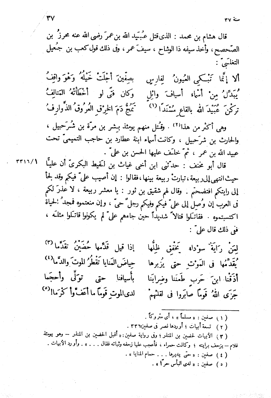 قَالَ هِشَام بن مُحَمَّد: الَّذِي قتل عُبَيْد اللَّهِ بن عُمَرَ رَضِيَ اللَّهُ عَنْهُ محرز بن الصحصح، وأخذ سيفه ذا الوشاح، سيف عمر، وفي ذَلِكَ قول كعب بن جعيل التغلبي: