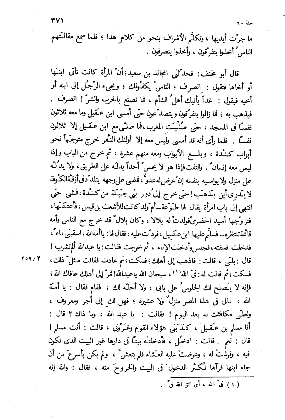 قَالَ أَبُو مخنف: فَحَدَّثَنِي الْمُجَالِد بن سَعِيد، أن المرأة كَانَتْ تأتي ابنها أو أخاها فتقول: انصرف، الناس يكفونك، ويجيء الرجل إِلَى ابنه أو أخيه فيقول: غدا يأتيك أهل الشام، فما تصنع بالحرب والشر! انصرف فيذهب بِهِ، فما زالوا يتفرقون ويتصدعون حَتَّى أمسى ابن عقيل وما مَعَهُ ثلاثون نفسا فلما رَأَى إنه قَدْ أمسى وليس مَعَهُ إلا أُولَئِكَ النفر خرج متوجها نحو أبواب كندة، وبلغ الأبواب وَمَعَهُ مِنْهُمْ عشرة، ثُمَّ خرج من الباب وإذا ليس مَعَهُ إنسان، والتفت فإذا هُوَ لا يحس أحدا يدله عَلَى الطريق، وَلا يدله عَلَى منزل وَلا يواسيه بنفسه إن عرض لَهُ عدو، فمضى عَلَى وجهه يتلدد فِي أزقة الْكُوفَة لا يدري أين يذهب! حَتَّى خرج إِلَى دور بني جبلة من كندة، فمشى حَتَّى انتهى إِلَى باب امرأة يقال لها طوعة- أم ولد كَانَتْ للأشعث بن قيس، فأعتقها، فتزوجها أسيد الحضرمي فولدت لَهُ بلالا، وَكَانَ بلال، قَدْ خرج مع الناس وأمه قائمة تنتظره- فسلم عَلَيْهَا ابن عقيل، فردت عَلَيْهِ، فَقَالَ لها: يَا أمة اللَّه، اسقيني ماء، فدخلت فسقته، فجلس وأدخلت الإناء، ثُمَّ خرجت فَقَالَتْ: يَا عَبْد اللَّهِ ألم تشرب! قَالَ: بلى، قالت: فاذهب إِلَى أهلك، فسكت، ثُمَّ عادت فَقَالَتْ مثل ذَلِكَ، فسكت، ثُمَّ قالت له: في الله، سبحان اللَّه يَا عَبْد اللَّهِ! فمر إِلَى أهلك عافاك اللَّه، فإنه لا يصلح لك الجلوس عَلَى بابي، وَلا أحله لك، فقام فَقَالَ: يَا أمة اللَّه، مَا لي فِي هَذَا المصر منزل وَلا عشيرة، فهل لك إِلَى أجر ومعروف، ولعلي مكافئك بِهِ بعد الْيَوْم! فَقَالَتْ: يَا عَبْد اللَّهِ، وما ذاك؟ قَالَ: