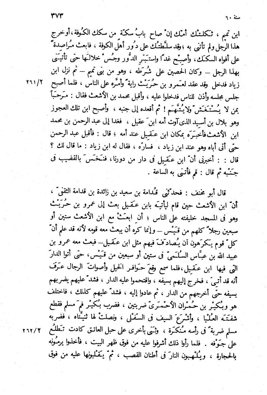 قَالَ أَبُو مخنف: فَحَدَّثَنِي قدامة بن سَعِيد بن زائدة بن قدامة الثقفي، أن ابن الأشعث حين قام ليأتيه بابن عقيل بعث إِلَى عَمْرو بن حريث وَهُوَ فِي المسجد خليفته عَلَى الناس، أن ابعث مع ابن الأشعث ستين أو سبعين رجلا كلهم من قيس- وإنما كره أن يبعث مَعَهُ قومه لأنه قَدْ علم أن كل قوم يكرهون أن يصادف فِيهِمْ مثل ابن عقيل- فبعث مَعَهُ عَمْرو بن عُبَيْد اللَّهِ بن عباس السلمي فِي ستين أو سبعين من قيس، حَتَّى أتوا الدار الَّتِي فِيهَا ابن عقيل، فلما سمع وقع حوافر الخيل وأصوات الرجال عرف أنه قَدْ أتي، فخرج إِلَيْهِم بسيفه، واقتحموا عَلَيْهِ الدار، فشد عَلَيْهِم يضربهم بسيفه حَتَّى أخرجهم من الدار، ثُمَّ عادوا إِلَيْهِ، فشد عَلَيْهِم كذلك، فاختلف هُوَ وبكير بن حمران الأحمري ضربتين، فضرب بكير فم مسلم فقطع شفته العليا، وأشرع السيف فِي السفلى، ونصلت لها ثنيتاه، فضربه مسلم ضربة فِي رأسه منكرة، وثنى بأخرى عَلَى حبل العاتق كادت تطلع عَلَى جوفه فلما رأوا ذَلِكَ أشرفوا عَلَيْهِ من فوق ظهر البيت، فأخذوا يرمونه بالحجارة، ويلهبون النار فِي أطنان القصب، ثُمَّ يقلبونها عَلَيْهِ من فوق