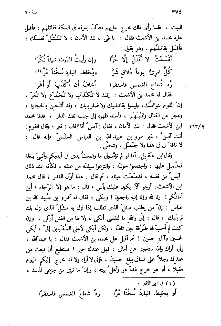 البيت، فلما رَأَى ذَلِكَ خرج عَلَيْهِم مصلتا بسيفه فِي السكة فقاتلهم، فأقبل عَلَيْهِ مُحَمَّد بن الأشعث فَقَالَ: يَا فتى، لك الأمان، لا تقتل نفسك، فأقبل يقاتلهم، وَهُوَ يقول: