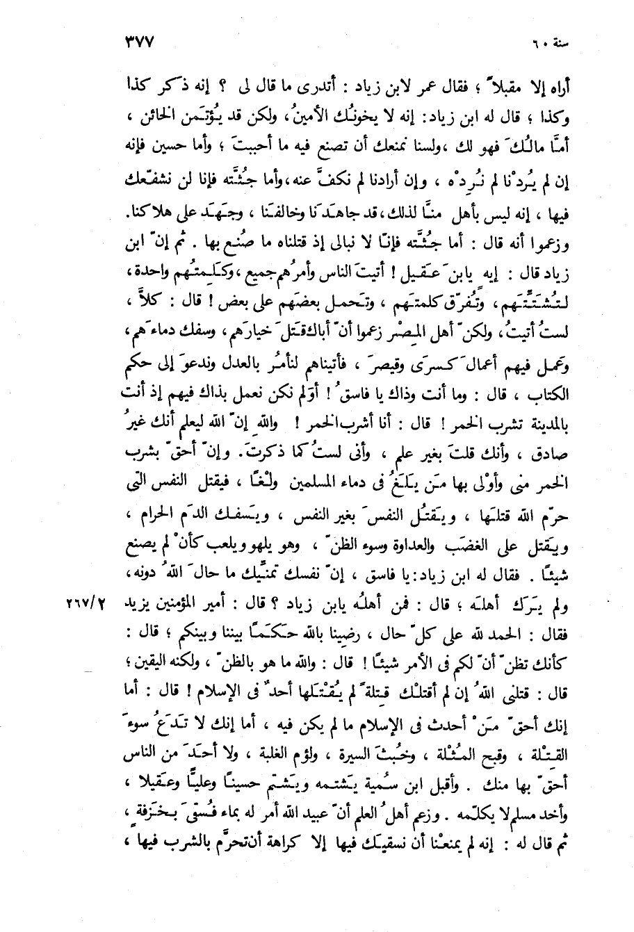 وزعموا أنه قال: اما جثته فانا لا نبالى إذ قتلناه مَا صنع بِهَا ثُمَّ إن ابن زياد قال: ايه يا بن عقيل! أتيت الناس وأمرهم جميع، وكلمتهم واحدة، لتشتتهم، وتفرق كلمتهم، وتحمل بعضهم عَلَى بعض! قَالَ: كلا، لست أتيت، ولكن أهل المصر زعموا أن أباك قتل خيارهم، وسفك دماءهم، وعمل فِيهِمْ أعمال كسرى وقيصر، فأتيناهم لنأمر بالعدل وندعو إِلَى حكم الكتاب، قَالَ: وما أنت وذاك يا فاسق! او لم نكن نعمل بذاك فِيهِمْ إذ أنت بِالْمَدِينَةِ تشرب الخمر! قَالَ: أنا أشرب الخمر! وَاللَّهِ إن اللَّه ليعلم أنك غير صادق، وأنك قلت بغير علم، وأني لست كما ذكرت وان أحق بشرب الخمر مني وأولى بِهَا من يلغ فِي دماء الْمُسْلِمِينَ ولغا، فيقتل النفس الَّتِي حرم اللَّه قتلها، ويقتل النفس بغير النفس، ويسفك الدم الحرام، ويقتل عَلَى الغضب والعداوة وسوء الظن، وَهُوَ يلهو ويلعب كأن لم يصنع شَيْئًا فَقَالَ لَهُ ابن زياد: يَا فاسق، إن نفسك تمنيك مَا حال اللَّه دونه، ولم يرك أهله، قَالَ: فمن اهله يا بن زياد؟ قَالَ: أَمِير الْمُؤْمِنِينَ يَزِيد فَقَالَ: الحمد لِلَّهِ عَلَى كل حال، رضينا بِاللَّهِ حكما بيننا وبينكم، قَالَ: