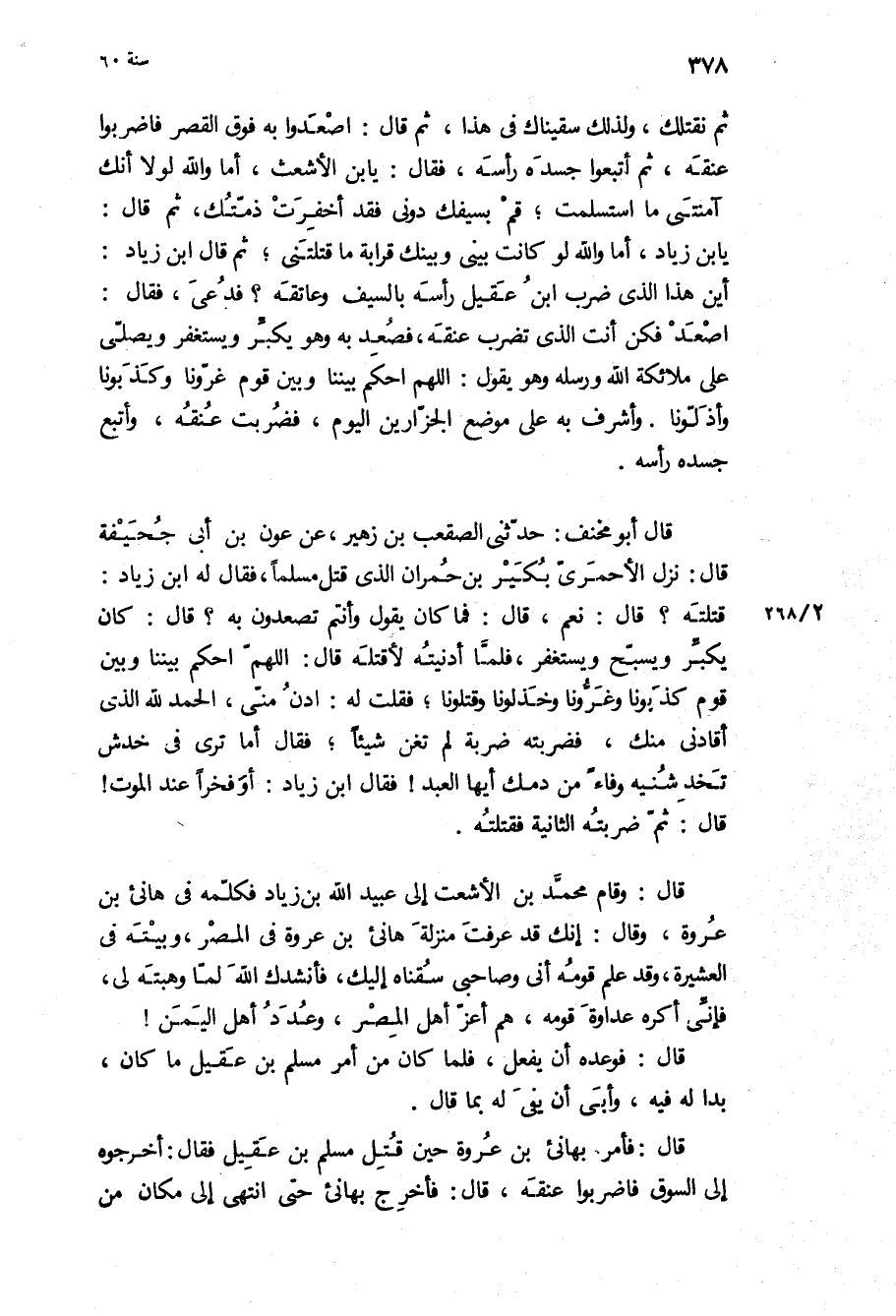 ثُمَّ نقتلك، ولذلك سقيناك فِي هَذَا، ثُمَّ قَالَ: اصعدوا بِهِ فوق القصر فاضربوا عنقه، ثم اتبعوا جسده راسه، فقال: يا بن الأشعث، أما وَاللَّهِ لولا أنك آمنتني مَا استسلمت، قم بسيفك دوني فقد أخفرت ذمتك، ثم قال: