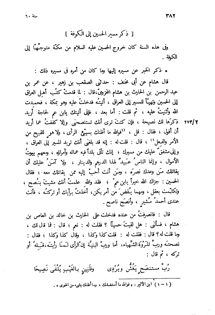 قَالَ هِشَام عن أبي مخنف: حَدَّثَنِي الصَّقْعَبُ بْنُ زُهَيْرٍ، عَنْ عُمَر بْنِ عَبْدِ الرَّحْمَنِ بْنِ الْحَارِثِ بْنِ هِشَامٍ المخزومي، قَالَ: لما قدمت كتب أهل العراق إِلَى الْحُسَيْن وتهيأ للمسير إِلَى العراق، أتيته فدخلت عَلَيْهِ وَهُوَ بمكة، فحمدت اللَّه وأثنيت عَلَيْهِ، ثُمَّ قلت: أَمَّا بَعْدُ، فإني أتيتك يا بن عم لحاجة أريد ذكرها لك نصيحة، فإن كنت ترى أنك تستنصحني وإلا كففت عما اريد ان اقول، فقال: قل، فو الله ما اظنك بسيئ الرأي، ولا هو للقبيح من الأمر والفعل، قَالَ: قلت لَهُ: إنه قَدْ بلغني أنك تريد المسير إِلَى العراق، وإني مشفق عَلَيْك من مسيرك، إنك تأتي بلدا فِيهِ عماله وأمراؤه، ومعهم بيوت الأموال، وإنما الناس عبيد لهذا الدرهم والدينار، وَلا آمن عَلَيْك أن يقاتلك من وعدك نصره، ومن أنت أحب إِلَيْهِ ممن يقاتلك مَعَهُ، [فقال الحسين: جزاك الله خيرا يا بن عم، فقد وَاللَّهِ علمت أنك مشيت بنصح، وتكلمت بعقل، ومهما يقض من أمر يكن، أخذت برأيك أو تركته، فأنت عندي أحمد مشير، وأنصح ناصح] .