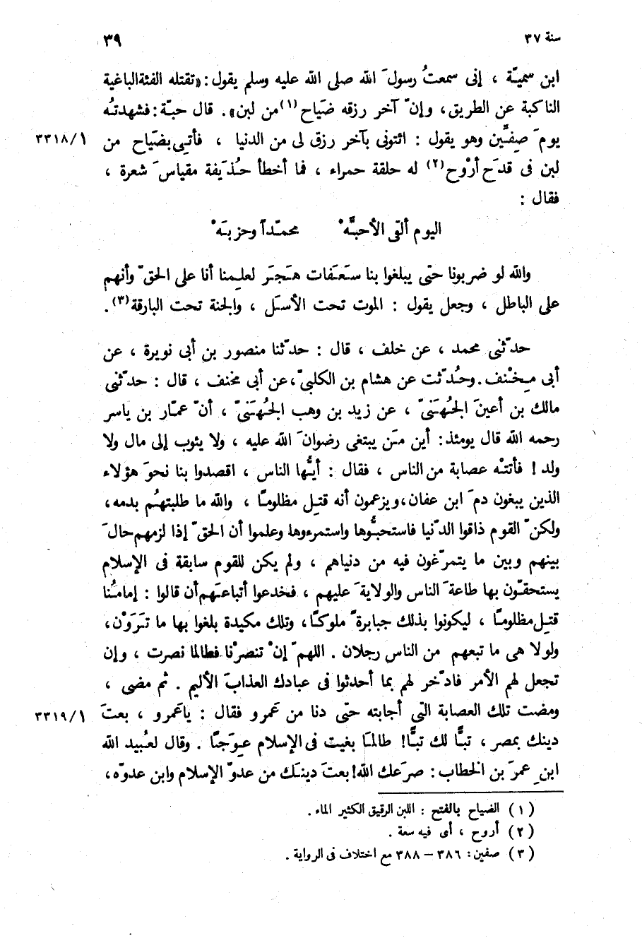 حَدَّثَنِي مُحَمَّدٌ، عَنْ خَلَفٍ، قَالَ: حَدَّثَنَا مَنْصُورُ بْنُ أَبِي نُوَيْرَةَ، عَنْ أَبِي مِخْنَفٍ وَحُدِّثْتُ عَنْ هِشَامِ بْنِ الْكَلْبِيِّ، عَنْ أَبِي مِخْنَفٍ، قَالَ: حَدَّثَنِي مَالِكُ بْنُ أَعْيَنَ الْجُهَنِيُّ، عَنْ زَيْدِ بْنِ وَهْبٍ الْجُهَنِيِّ، أَنَّ عَمَّارَ بْنَ يَاسِرٍ رَحِمَهُ اللَّهُ قَالَ يَوْمَئِذٍ: أَيْنَ مَنْ يَبْتَغِي رِضْوَانَ اللَّهِ عَلَيْهِ، وَلا يَئُوبُ إِلَى مَالٍ وَلا وَلَدٍ! فَأَتَتْهُ عِصَابَةٌ مِنَ النَّاسِ، فَقَالَ: أَيُّهَا النَّاسُ، اقْصِدُوا بِنَا نَحْوَ هَؤُلاءِ الَّذِينَ يَبْغُونَ دَمَ ابْنِ عَفَّانَ، وَيَزْعُمُونَ أَنَّهُ قُتِلَ مَظْلُومًا، وَاللَّهِ مَا طَلَبْتُهُمْ بِدَمِهِ، وَلَكِنِ الْقَوْمُ ذَاقُوا الدُّنْيَا فَاسْتَحَبُّوهَا وَاسْتَمْرَءُوهَا وَعَلِمُوا أَنَّ الْحَقَّ إِذَا لَزِمَهُمْ حَالَ بَيْنَهُمْ وَبَيْنَ مَا يَتَمَرَّغُونَ فِيهِ مِنْ دُنْيَاهُمْ، وَلَمْ يَكُنْ لِلْقَوْمِ سَابِقَةٌ فِي الإِسْلامِ يَسْتَحِقُّونَ بِهَا طَاعَةَ النَّاسِ وَالْوِلايَةَ عَلَيْهِمْ، فَخَدَعُوا أَتْبَاعَهُمْ أَنْ قَالُوا: إِمَامُنَا قُتِلَ مَظْلُومًا، لِيَكُونُوا بِذَلِكَ جَبَابِرَةً مُلُوكًا، وَتِلْكَ مَكِيدَةٌ بَلَغُوا بِهَا مَا تَرَوْنَ، وَلَوْلا هِيَ ما تبعهم من الناس رَجُلانِ اللَّهُمَّ إِنْ تَنْصُرْنَا فَطَالَمَا نُصِرْتَ، وَإِنْ تَجْعَلْ لَهُمُ الأَمْرَ فَادَّخِرْ لَهُمْ بِمَا أَحْدَثُوا فِي عِبَادِكَ الْعَذَابَ الأَلِيمَ ثُمَّ مَضَى، وَمَضَتْ تِلَكَ الْعِصَابَةُ الَّتِي أَجَابَتْهُ حَتَّى دَنَا مِنْ عَمْرٍو فَقَالَ: يَا عَمْرُو، بِعْتَ دِينَكَ بِمِصْرَ، تَبًّا لَكَ تَبًّا! طَالَمَا بَغَيْتَ فِي الإِسْلامِ عوجا وقال لعبيد الله ابن عُمَرَ بْنِ الْخَطَّابِ: صَرَعَكَ اللَّهُ! بِعْتَ دِينَكَ مِنْ عَدِوِّ الإِسْلامِ وَابْنِ عَدُوِّهِ،