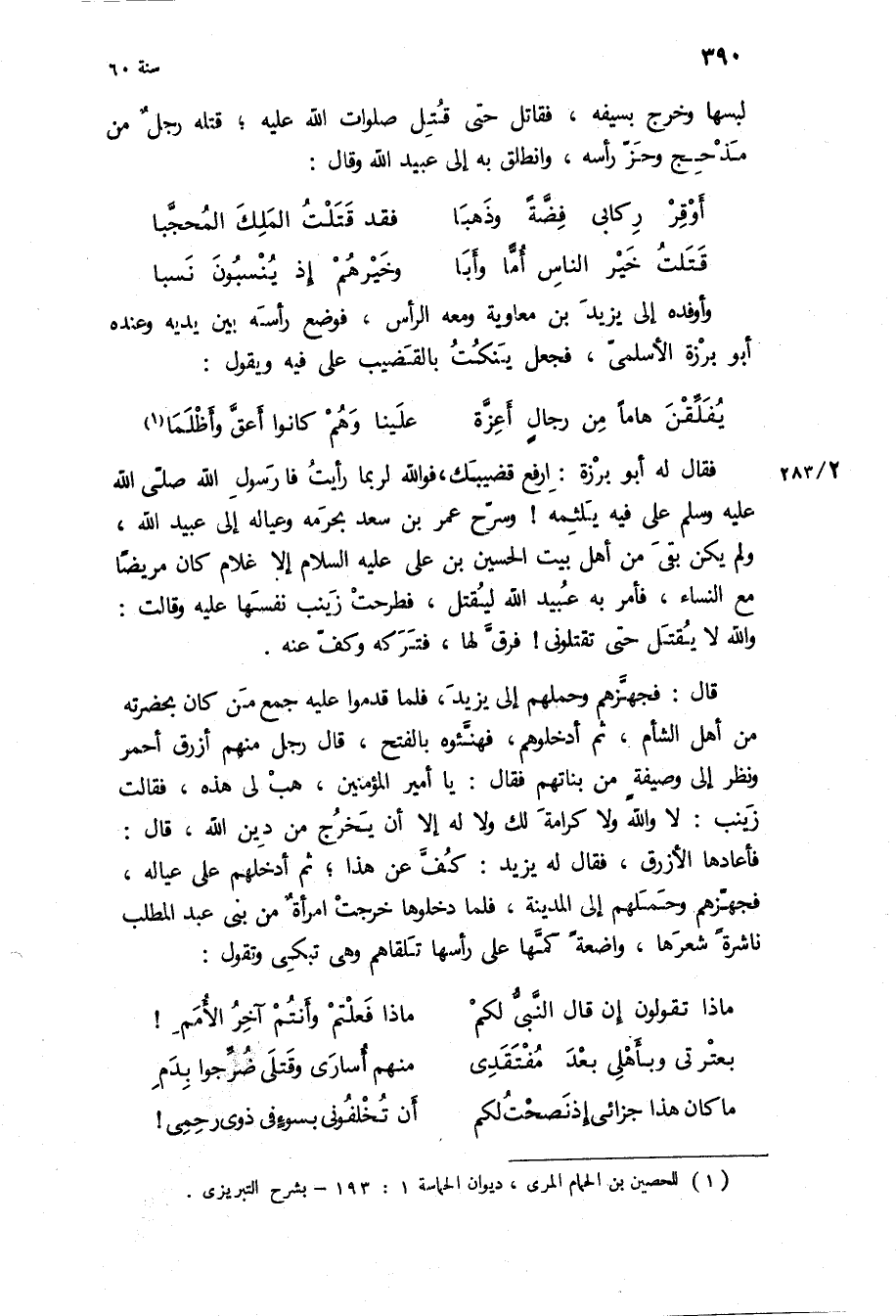 فأعادها الأزرق، فَقَالَ لَهُ يَزِيد: كف عن هَذَا، ثُمَّ أدخلهم عَلَى عياله، فجهزهم وحملهم إِلَى الْمَدِينَة، فلما دخلوها خرجت امرأة من بني عبد المطلب ناشرة شعرها، واضعة كمها عَلَى رأسها تلقاهم وَهِيَ تبكي وتقول: