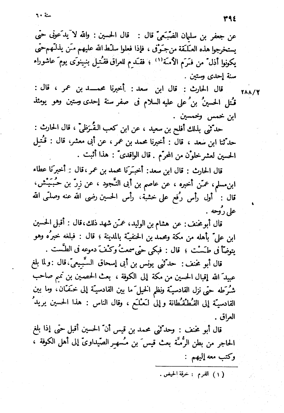 عَنْ جَعْفَرِ بْنِ سُلَيْمَانَ الضُّبَعِيِّ قَالَ: [قَالَ الْحُسَيْنُ: وَاللَّهِ لا يَدْعُونِي حَتَّى يَسْتَخْرِجُوا هَذِهِ الْعَلَقَةَ مِنْ جَوْفِي، فَإِذَا فَعَلُوا سَلَّطَ اللَّهُ عَلَيْهِمْ مَنْ يُذِلَّهُمْ حَتَّى يَكُونُوا أَذَلَّ مَنْ فرم الامه،] فقدم للعراق فَقَتَلَ بِنِينَوَى يَوْمَ عَاشُورَاءَ سَنَةَ إِحْدَى وَسِتِّينَ.