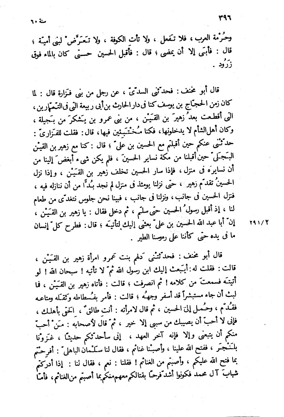 حَدَّثَنِي عنكم حين أقبلتم مع الْحُسَيْن بن علي، قَالَ: كنا مع زهير بن القين البجلي حين أقبلنا مِنْ مَكَّةَ نساير الْحُسَيْن، فلم يكن شَيْء أبغض إلينا من أن نسايره فِي منزل، فإذا سار الْحُسَيْن تخلف زهير بن القين، وإذا نزل الْحُسَيْن تقدم زهير، حَتَّى نزلنا يَوْمَئِذٍ فِي منزل لم نجد بدا من أن ننازله فِيهِ، فنزل الْحُسَيْن فِي جانب، ونزلنا فِي جانب، فبينا نحن جلوس نتغدى من طعام لنا، إذ أقبل رسول الْحُسَيْن حَتَّى سلم، ثُمَّ دخل فَقَالَ: يَا زهير بن القين، إن أبا عَبْد اللَّهِ الْحُسَيْن بن علي بعثني إليك لتأتيه، قَالَ: فطرح كل إنسان مَا فِي يده حَتَّى كأننا عَلَى رءوسنا الطير.