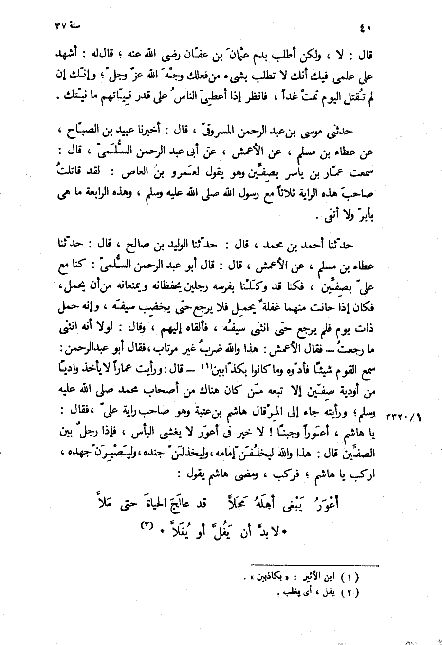 حَدَّثَنَا أَحْمَد بن مُحَمَّدٍ، قَالَ: حَدَّثَنَا الْوَلِيد بن صالح، قَالَ: حَدَّثَنَا عطاء بن مسلم، عَنِ الأَعْمَشِ، قَالَ: قَالَ أَبُو عبد الرَّحْمَن السلمي: كنا مع علي بصفين، فكنا قَدْ وكلنا بفرسه رجلين يحفظانه ويمنعانه من أن يحمل، فكان إذا حانت منهما غفلة يحمل فلا يرجع حَتَّى يخضب سيفه، وإنه حمل ذات يوم فلم يرجع حَتَّى انثنى سيفه، فألقاه إِلَيْهِم، وَقَالَ: لولا أنه انثنى مَا رجعت- فَقَالَ الأعمش: هَذَا وَاللَّهِ ضرب غير مرتاب، فَقَالَ أَبُو عبد الرَّحْمَن: