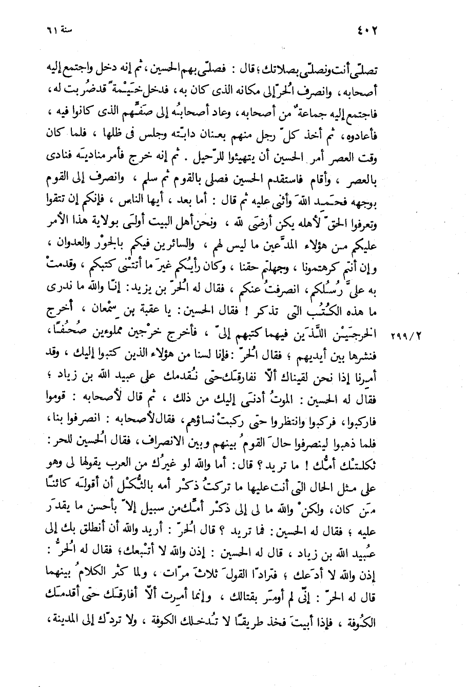 تصلي أنت ونصلي بصلاتك، قَالَ: فصلى بهم الْحُسَيْن، ثُمَّ إنه دخل واجتمع إِلَيْهِ أَصْحَابه، وانصرف الحر إِلَى مكانه الَّذِي كَانَ بِهِ، فدخل خيمة قَدْ ضربت لَهُ، فاجتمع إِلَيْهِ جماعة من أَصْحَابه، وعاد أَصْحَابه إِلَى صفهم الَّذِي كَانُوا فِيهِ، فأعادوه، ثُمَّ أخذ كل رجل مِنْهُمْ بعنان دابته وجلس فِي ظلها، فلما كَانَ وقت العصر أمر الْحُسَيْن أن يتهيئوا للرحيل ثُمَّ إنه خرج فأمر مناديه فنادى بالعصر، وأقام فاستقدم الْحُسَيْن فصلى بالقوم ثُمَّ سلم، وانصرف إِلَى القوم بوجهه فَحَمِدَ اللَّهَ وَأَثْنَى عَلَيْهِ ثُمَّ قَالَ: أَمَّا بَعْدُ، أَيُّهَا النَّاسُ، فإنكم إن تتقوا وتعرفوا الحق لأهله يكن أرضى لِلَّهِ، ونحن أهل البيت أولى بولاية هَذَا الأمر عَلَيْكُمْ من هَؤُلاءِ المدعين مَا ليس لَهُمْ، والسائرين فيكم بالجور والعدوان، وإن أنتم كرهتمونا، وجهلتم حقنا، وَكَانَ رأيكم غير مَا أتتني كتبكم، وقدمت بِهِ علي رسلكم، انصرفت عنكم، فَقَالَ لَهُ الحر بن يَزِيدَ: إنا وَاللَّهِ مَا ندري مَا هَذِهِ الكتب الَّتِي تذكر! فَقَالَ الْحُسَيْن: يَا عقبة بن سمعان، أخرج الخرجين اللذين فيهما كتبهم إلي، فأخرج خرجين مملوءين صحفا، فنشرها بين أيديهم، فَقَالَ الحر: فإنا لسنا من هَؤُلاءِ الَّذِينَ كتبوا إليك، وَقَدْ أمرنا إذا نحن لقيناك الا نفارقك حَتَّى نقدمك عَلَى عُبَيْد اللَّهِ بن زياد، [فَقَالَ لَهُ الْحُسَيْن: الموت أدنى إليك من ذَلِكَ،] ثُمَّ قَالَ لأَصْحَابه: قوموا فاركبوا، فركبوا وانتظروا حَتَّى ركبت نساؤهم، فَقَالَ لأَصْحَابه: انصرفوا بنا، فلما ذهبوا لينصرفوا حال القوم بينهم وبين الانصراف، فَقَالَ الْحُسَيْن للحر: