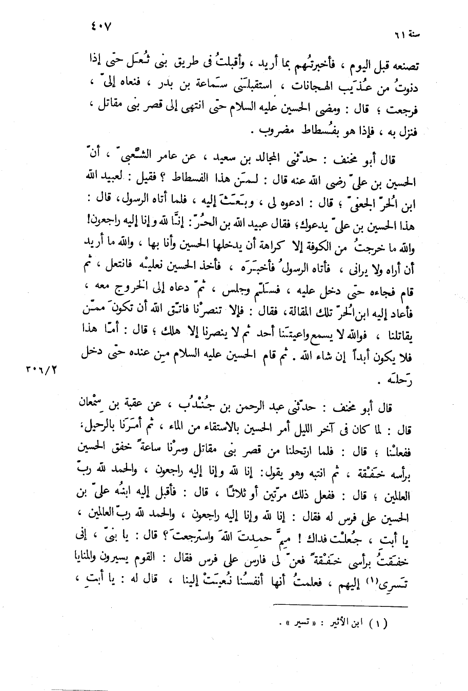 تصنعه قبل الْيَوْم، فأخبرتهم بِمَا أريد، وأقبلت فِي طريق بني ثعل حَتَّى إذا دنوت من عذيب الهجانات، استقبلني سماعة بن بدر، فنعاه الى، فرجعت، قال: ومضى الحسين ع حَتَّى انتهى إِلَى قصر بني مقاتل، فنزل بِهِ، فإذا هُوَ بفسطاط مضروب.
