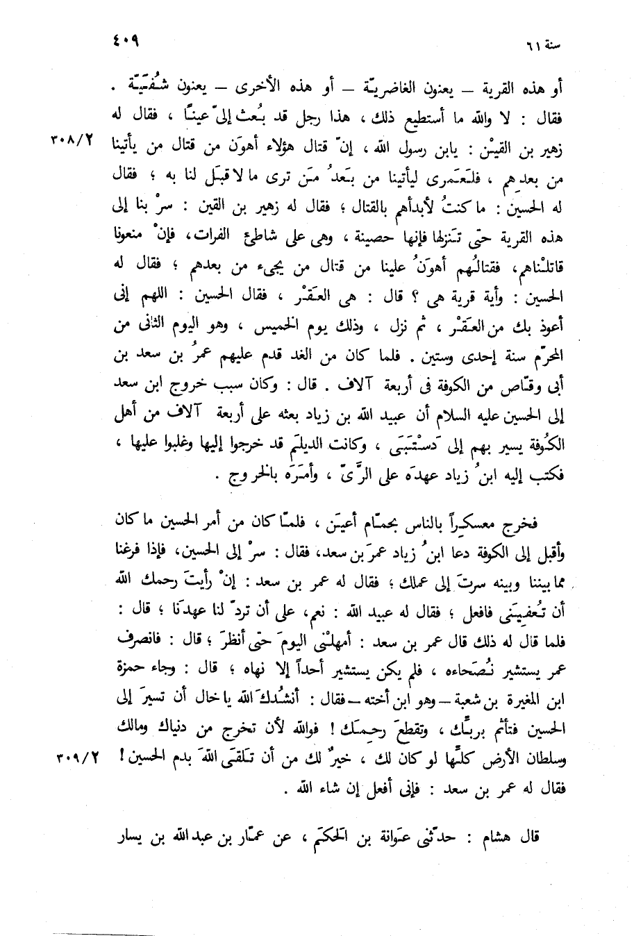 فَقَالَ: لا وَاللَّهِ مَا أستطيع ذَلِكَ، هَذَا رجل قَدْ بعث إلي عينا، فَقَالَ لَهُ زهير بن القين: يا بن رَسُول اللَّهِ، إن قتال هَؤُلاءِ أهون من قتال من يأتينا من بعدهم، فلعمري ليأتينا من بعد من ترى مَا لا قبل لنا بِهِ، [فَقَالَ لَهُ الْحُسَيْن: مَا كنت لأبدأهم بالقتال،] فَقَالَ لَهُ زهير بن القين: سر بنا الى هذه القرية حتى تنزلها فإنها حصينة، وَهِيَ عَلَى شاطئ الفرات، فإن منعونا قاتلناهم، فقتالهم أهون علينا من قتال من يجيء من بعدهم، فَقَالَ لَهُ الْحُسَيْن: وأية قرية هي؟ قَالَ: هي العقر، فَقَالَ الْحُسَيْن: اللَّهُمَّ إني أعوذ بك من العقر، ثُمَّ نزل، وَذَلِكَ يوم الخميس، وَهُوَ الْيَوْم الثاني من المحرم سنة إحدى وستين فلما كَانَ من الغد قدم عَلَيْهِم عُمَر بن سَعْدِ بْنِ أَبِي وَقَّاص من الْكُوفَة فِي أربعة آلاف قَالَ: وَكَانَ سبب خروج ابن سعد الى الحسين ع أن عُبَيْد اللَّهِ بن زياد بعثه عَلَى أربعة آلاف من أهل الْكُوفَة يسير بهم إِلَى دَسْتَبَى، وكانت الديلم قَدْ خرجوا إِلَيْهَا وغلبوا عَلَيْهَا، فكتب إِلَيْهِ ابن زياد عهده عَلَى الري، وأمره بالخروج.