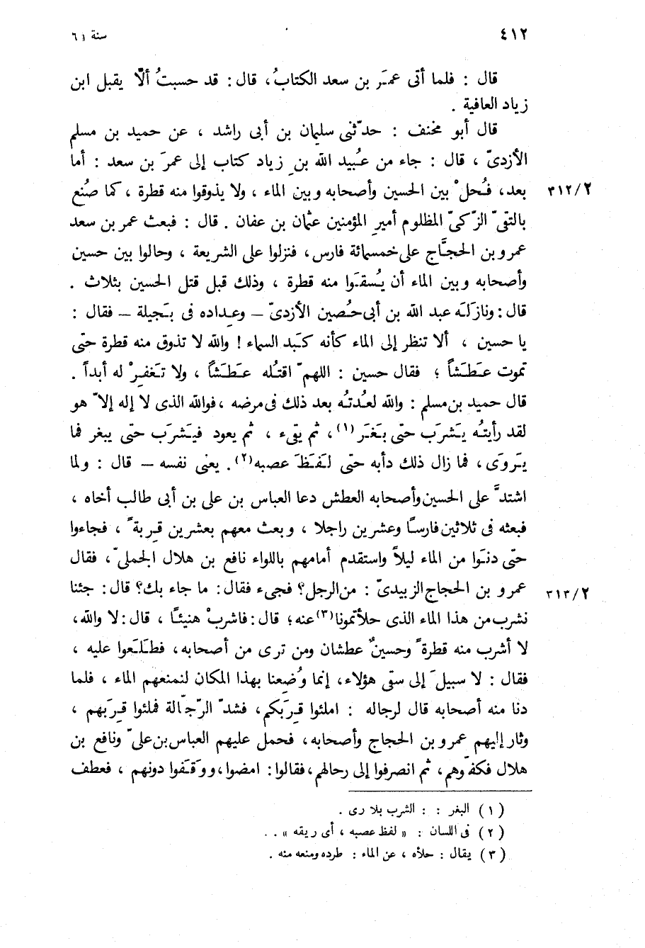 قَالَ حميد بن مسلم: وَاللَّهِ لعدته بعد ذلك في مرضه، فو الله الَّذِي لا إله إلا هُوَ لقد رأيته يشرب حَتَّى بغر، ثُمَّ يقيء، ثُمَّ يعود فيشرب حَتَّى يبغر فما يروى، فما زال ذلك دابه حتى لفظ عصبه يعني نفسه- قَالَ: ولما اشتد عَلَى الْحُسَيْن وأَصْحَابه العطش دعا العباس بن عَلِيّ بن أبي طالب أخاه، فبعثه فِي ثَلاثِينَ فارسا وعشرين راجلا، وبعث معهم بعشرين قربة، فجاءوا حَتَّى دنوا من الماء ليلا واستقدم أمامهم باللواء نافع بن هلال الْجَمَلِيّ، فَقَالَ عَمْرو بن الحجاج الزبيدى: من الرجل؟ فجيء فقال: مَا جَاءَ بك؟ قَالَ: جئنا نشرب من هَذَا الماء الَّذِي حلأتمونا عنه، قَالَ: فاشرب هنيئا، قَالَ: لا وَاللَّهِ، لا أشرب مِنْهُ قطرة وحسين عطشان ومن ترى من أَصْحَابه، فطلعوا عَلَيْهِ، فَقَالَ: لا سبيل إِلَى سقي هَؤُلاءِ، إنما وضعنا بهذا المكان لنمنعهم الماء، فلما دنا مِنْهُ أَصْحَابه قَالَ لرجاله: املئوا قربكم، فشد الرجالة فملئوا قربهم، وثار إِلَيْهِم عَمْرو بن الحجاج وأَصْحَابه، فحمل عَلَيْهِم العباس بن علي ونافع بن هلال فكفوهم، ثُمَّ انصرفوا إِلَى رحالهم، فَقَالُوا: امضوا، ووقفوا دونهم، فعطف