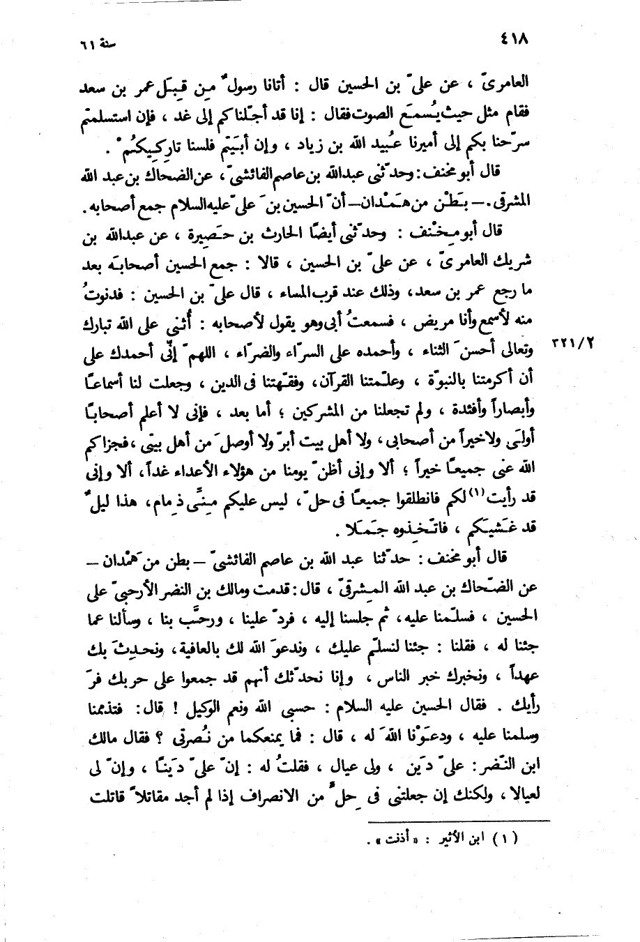 قَالَ أَبُو مخنف: حَدَّثَنَا عَبْد اللَّهِ بن عاصم الفائشي- بطن من همدان- عن الضحاك بن عَبْدِ اللَّهِ المشرقي، قَالَ: قدمت ومالك بن النضر الأرحبي عَلَى الْحُسَيْن، فسلمنا عَلَيْهِ، ثُمَّ جلسنا إِلَيْهِ، فرد علينا، ورحب بنا، وسألنا عما جئنا لَهُ، فقلنا: جئنا لنسلم عَلَيْك، وندعو اللَّه لك بالعافية، ونحدث بك عهدا، ونخبرك خبر الناس، وإنا نحدثك أَنَّهُمْ قَدْ جمعوا عَلَى حربك فر رأيك [فقال الحسين ع: حسبي اللَّه ونعم الوكيل!] قَالَ: فتذممنا وَسَلَّمنا عَلَيْهِ، ودعونا اللَّه لَهُ، قَالَ: فما يمنعكما من نصرتي؟ فقال مالك ابن النضر: عليّ دين، ولي عيال، فقلت لَهُ: إن علي دينا، وإن لي لعيالا، ولكنك إن جعلتني فِي حل من الانصراف إذا لم أجد مقاتلا قاتلت