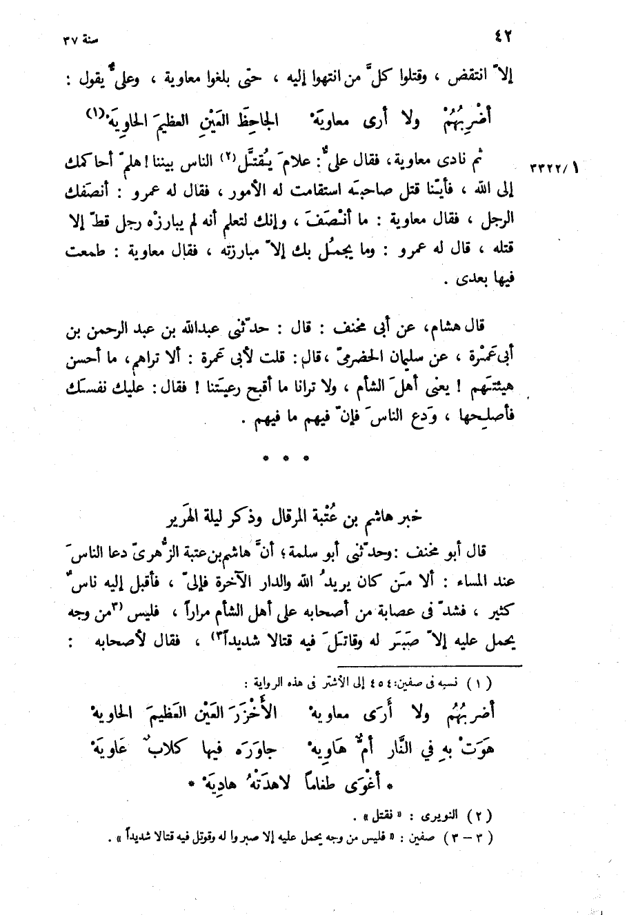 قَالَ أَبُو مخنف: وَحَدَّثَنِي أَبُو سلمة، أن هاشم بن عتبة الزُّهْرِيّ دعا الناس عِنْدَ المساء: أَلا من كَانَ يريد اللَّه والدار الآخرة فإلي، فأقبل إِلَيْهِ ناس كثير، فشد فِي عصابة من أَصْحَابه عَلَى أهل الشام مرارا، فليس من وجه يحمل عَلَيْهِ إلا صبر لَهُ وقاتل فِيهِ قتالا شديدا، فَقَالَ لأَصْحَابه: