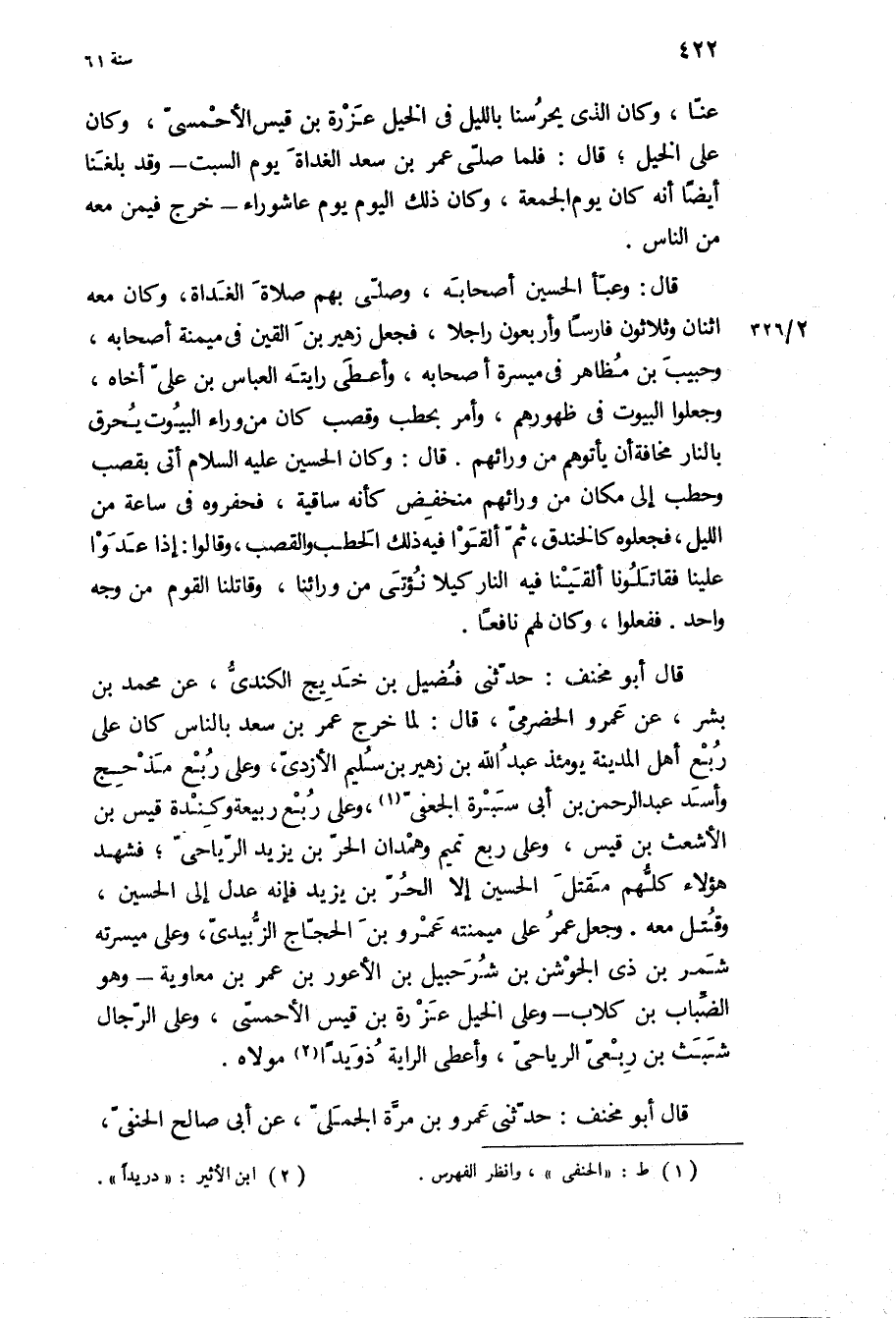 قَالَ أَبُو مخنف: حَدَّثَنِي فضيل بن خديج الكندي، عَنْ مُحَمَّدِ بْنِ بشر، عن عَمْرو الحضرمي، قَالَ: لما خرج عُمَر بن سَعْد بِالنَّاسِ كَانَ عَلَى ربع أهل الْمَدِينَة يَوْمَئِذٍ عَبْد اللَّهِ بن زهير بن سليم الأَزْدِيّ، وعلى ربع مذحج وأسد عبد الرَّحْمَن بن أبي سبرة الجعفي، وعلى ربع رَبِيعَة وكندة قيس بن الأشعث بن قيس، وعلى ربع تميم وهمدان الحر بن يَزِيدَ الرياحي، فشهد هَؤُلاءِ كلهم مقتل الْحُسَيْن إلا الحر بن يَزِيدَ فإنه عدل إِلَى الْحُسَيْن، وقتل مَعَهُ وجعل عمر عَلَى ميمنته عَمْرو بن الحجاج الزبيدي، وعلى ميسرته شمر بن ذي الجوشن بن شُرَحْبِيل بن الأعور بن عُمَرَ بن مُعَاوِيَة- وَهُوَ الضباب بن كلاب- وعلى الخيل عزرة بن قيس الأحمسي، وعلى الرجال شبث بن ربعي الرياحي، وأعطى الراية ذويدا مولاه.
