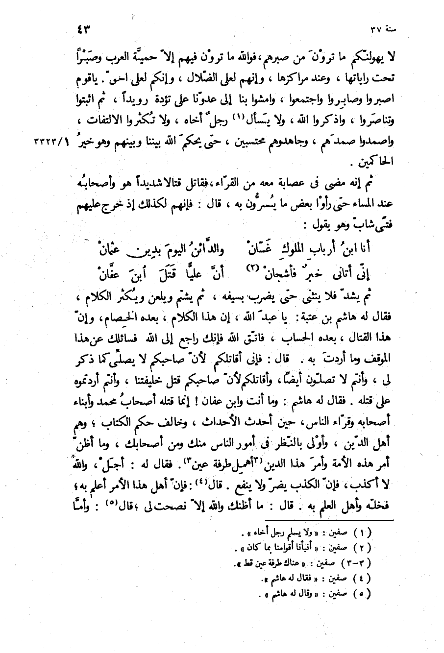ثُمَّ يشد فلا ينثني حتى يضرب بسيفه، ثم يشم ويلعن ويكثر الكلام، فَقَالَ لَهُ هاشم بن عتبة: يَا عَبْد اللَّهِ، إن هَذَا الكلام، بعده الخصام، وان هذا القتال، بعده الحساب، فاتق اللَّه فإنك راجع إِلَى اللَّهِ فسائلك عن هَذَا الموقف وما أردت بِهِ قَالَ: فإني أقاتلكم لأن صاحبكم لا يصلي كما ذكر لي، وَأَنْتُمْ لا تصلون أَيْضًا، وأقاتلكم لأن صاحبكم قتل خليفتنا، وَأَنْتُمْ أردتموه عَلَى قتله فَقَالَ لَهُ هاشم: وما أنت وابن عفان! إنما قتله أَصْحَاب مُحَمَّد وأبناء أَصْحَابه وقراء الناس، حين أحدث الأحداث، وخالف حكم الكتاب، وهم أهل الدين، وأولى بالنظر فِي أمور الناس مِنْكَ ومن أَصْحَابك، وما أظن أمر هَذِهِ الأمة وأمر هَذَا الدين أهمل طرفة عين فَقَالَ لَهُ: أجل، وَاللَّهِ لا أكذب، فإن الكذب يضر وَلا ينفع قَالَ: فإن أهل هَذَا الأمر أعلم بِهِ، فخله وأهل العلم بِهِ قَالَ: مَا أظنك وَاللَّهِ إلا نصحت لي، قَالَ: وأما