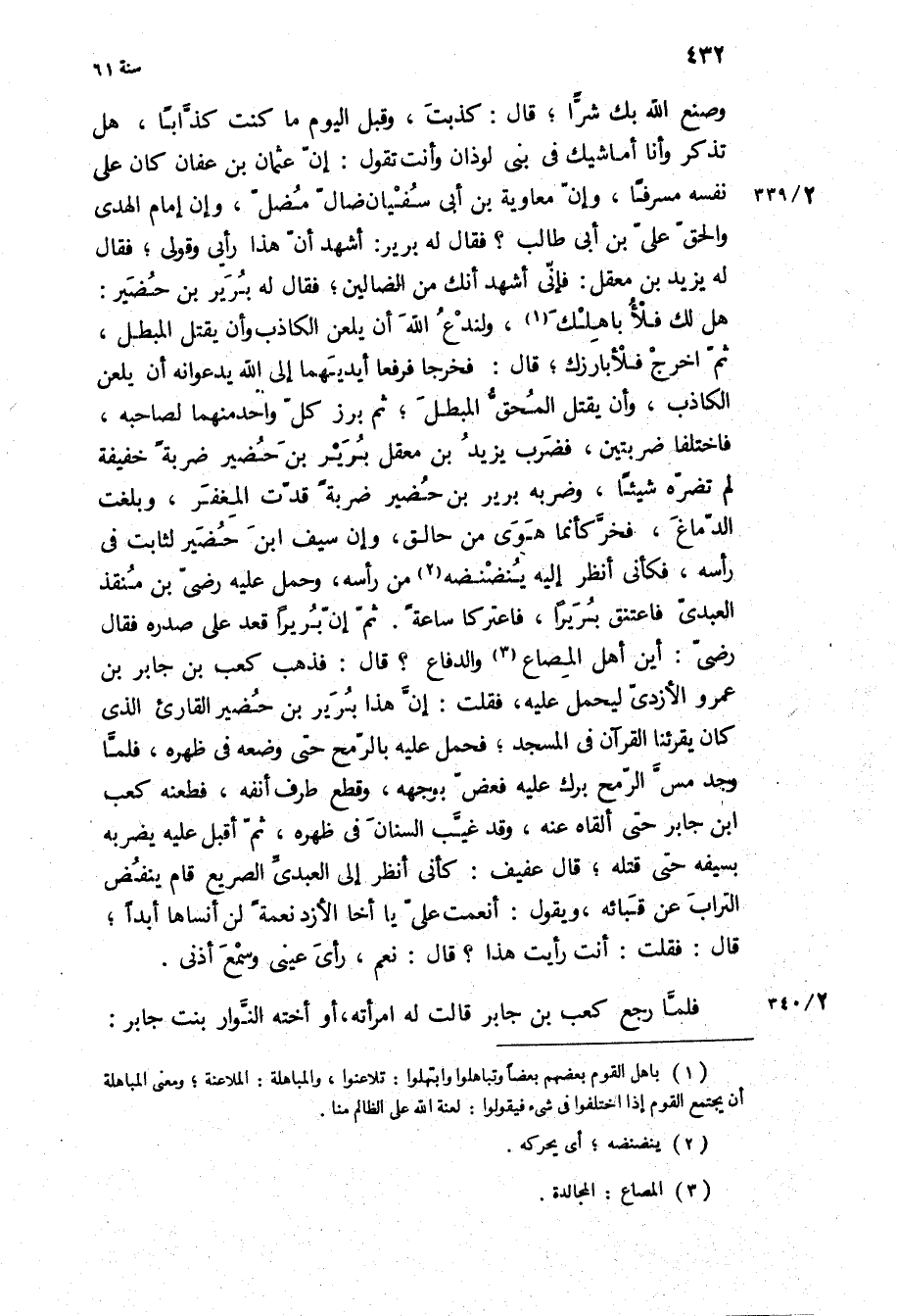 هل لك فلا باهلك، ولندع اللَّه أن يلعن الكاذب وأن يقتل المبطل، ثُمَّ اخرج فلأبارزك، قَالَ: فخرجا فرفعا أيديهما إِلَى اللَّهِ يدعوانه أن يلعن الكاذب، وأن يقتل المحق المبطل، ثُمَّ برز كل واحد منهما لصاحبه، فاختلفا ضربتين، فضرب يَزِيد بن معقل برير بن حضير ضربة خفيفة لم تضره شَيْئًا، وضربه برير بن حضير ضربة قدت المغفر، وبلغت الدماغ، فخر كأنما هوى من حالق، وان سيف ابن حضير لثابت فِي رأسه، فكأني أنظر إِلَيْهِ ينضنضه من رأسه، وحمل عَلَيْهِ رضي بن منقذ العبدي فاعتنق بريرا، فاعتركا ساعة ثُمَّ إن بريرا قعد عَلَى صدره فَقَالَ رضي: أين أهل المصاع والدفاع؟ قَالَ: فذهب كعب بن جابر بن عَمْرو الأَزْدِيّ ليحمل عَلَيْهِ، فقلت: إن هَذَا برير بن حضير القارئ الَّذِي كَانَ يقرئنا القرآن فِي المسجد، فحمل عَلَيْهِ بالرمح حَتَّى وضعه فِي ظهره، فلما وجد مس الرمح برك عَلَيْهِ فعض بوجهه، وقطع طرف انفه، فطعنه كعب ابن جابر حَتَّى ألقاه عنه، وَقَدْ غيب السنان فِي ظهره، ثُمَّ أقبل عَلَيْهِ يضربه بسيفه حَتَّى قتله، قَالَ عفيف: كأني أنظر إِلَى العبدي الصريع قام ينفض التراب عن قبائه، ويقول: أنعمت علي يَا أخا الأزد نعمة لن أنساها أبدا، قَالَ: فقلت: أنت رأيت هَذَا؟ قَالَ: نعم، رأي عيني وسمع أذني.