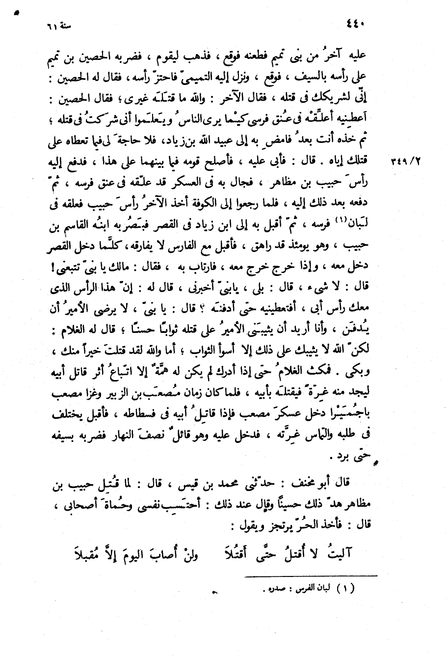 عَلَيْهِ آخر من بني تميم فطعنه فوقع، فذهب ليقوم، فضربه الحصين بن تميم عَلَى رأسه بالسيف، فوقع، ونزل إِلَيْهِ التميمي فاحتز رأسه، فَقَالَ لَهُ الحصين: