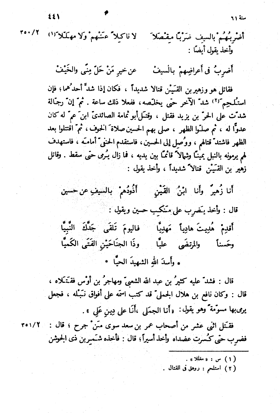 أضرب فِي أعراضهم بالسيف عن خير من حل منى والخيف فقاتل هُوَ وزهير بن القين قتالا شديدا، فكان إذا شد أحدهما، فإن استلحم شد الآخر حَتَّى يخلصه، ففعلا ذَلِكَ ساعة ثُمَّ إن رجالة شدت عَلَى الحر بن يَزِيدَ فقتل، وقتل أَبُو ثمامة الصائدي ابن عم لَهُ كَانَ عدوا لَهُ، ثُمَّ صلوا الظهر، صلى بهم الْحُسَيْن صلاة الخوف، ثُمَّ اقتتلوا بعد الظهر فاشتد قتالهم، ووصل إِلَى الْحُسَيْن، فاستقدم الحنفي أمامه، فاستهدف لَهُمْ يرمونه بالنبل يمينا وشمالا قائما بين يديه، فما زال يرمى حَتَّى سقط وقاتل زهير بن القين قتالا شديدا، وأخذ يقول: