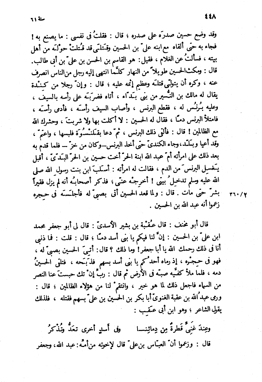 قَالَ أَبُو مخنف: قَالَ عقبة بن بشير الأسدي: [قَالَ لي أَبُو جَعْفَر مُحَمَّد ابن عَلِيّ بن الْحُسَيْن: إن لنا فيكم يَا بني أسد دما، قَالَ: قلت: فما ذنبي أنا فِي ذَلِكَ رحمك اللَّه يَا أَبَا جَعْفَر! وما ذَلِكَ؟ قَالَ: أتي الْحُسَيْن بصبي لَهُ، فهو فِي حجره، إذ رماه أحدكم يَا بني أسد بسهم فذبحه، فتلقى الْحُسَيْن دمه، فلما ملأ كفيه صبه فِي الأرض ثُمَّ قَالَ: رب إن تك حبست عنا النصر من السماء فاجعل ذَلِكَ لما هُوَ خير، وانتقم لنا من هَؤُلاءِ الظالمين،] قَالَ: