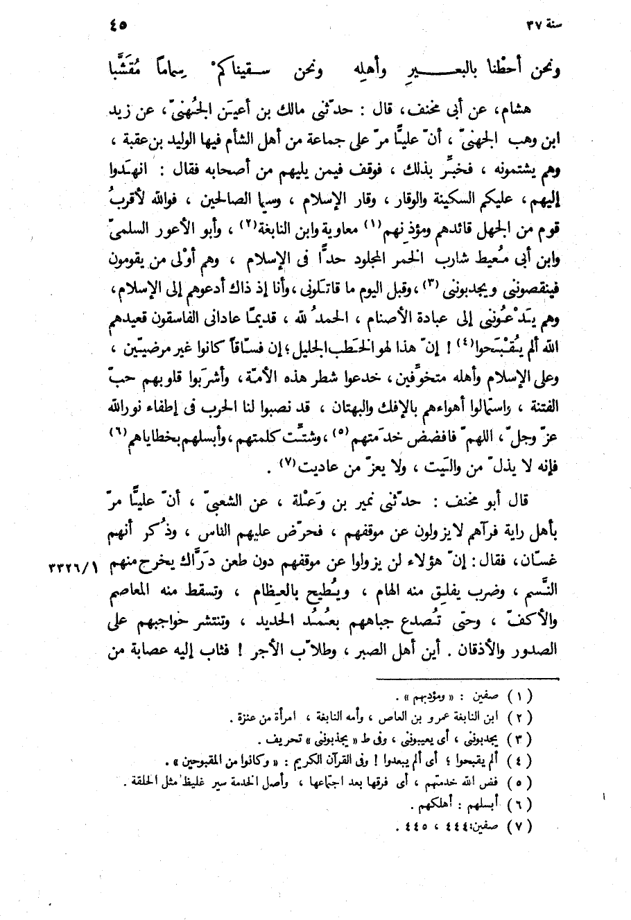هِشَامٌ، عَنْ أَبِي مِخْنَفٍ، قَالَ: حَدَّثَنِي مالك بن اعين الجهنى، عن زيد ابن وَهْبٍ الْجُهَنِيِّ، أَنَّ عَلِيًّا مَرَّ عَلَى جَمَاعَةٍ مِنْ أَهْلِ الشام فِيهَا الْوَلِيدُ بْنُ عُقْبَةَ، وَهُمْ يَشْتُمُونَهُ، فَخُبِّرَ بِذَلِكَ، فَوَقَفَ فِيمَنْ يَلِيهِمْ مِنْ أَصْحَابِهِ فَقَالَ: انْهَدُوا إِلَيْهِمْ، عَلَيْكُمُ السَّكِينَةُ والوقار، وقار الاسلام، وسيما الصالحين، فو الله لأَقْرَبُ قَوْمٌ مِنَ الْجَهْلِ قَائِدُهُمْ وَمُؤَذِّنُهُمْ مُعَاوِيَةُ وَابْنُ النَّابِغَةِ، وَأَبُو الأَعْوَرِ السُّلَمِيُّ وَابْنُ أَبِي مُعَيْطٍ شَارِبُ الْخَمْرِ الْمَجْلُودُ حَدًّا فِي الإِسْلامِ، وهم اولى من يقومون فينقصوننى ويجدبوننى، وَقَبْلَ الْيَوْمِ مَا قَاتَلُونِي، وَأَنَا إِذْ ذَاكَ أَدْعُوهُمْ إِلَى الإِسْلامِ، وَهُمْ يَدْعُونَنِي إِلَى عِبَادَةِ الأصنام، الحمد لله، قديما عاداني الفاسقون قعيدهم الله الم يقبحوا! أَنَّ هَذَا لَهُوَ الْخَطْبُ الْجَلِيلُ، إِنَّ فُسَّاقًا كَانُوا غَيْرَ مَرْضِيِّينَ، وَعَلَى الإِسْلامِ وَأَهْلِهِ مُتَخَوِّفِينَ، خَدَعُوا شَطْرَ هَذِهِ الأُمَّةِ، وَأَشْرَبُوا قُلُوبَهُمْ حُبَّ الْفِتْنَةِ، وَاسْتَمَالُوا أَهْوَاءَهُمْ بِالإِفْكِ وَالْبُهْتَانِ، قَدْ نَصَبُوا لَنَا الْحَرْبَ فِي إِطْفَاءِ نُورِ اللَّهِ عَزَّ وَجَلَّ، اللَّهُمَّ فَافْضُضْ خِدْمَتَهُمْ، وَشَتِّتْ كَلِمَتَهُمْ، وَأَبْسِلْهُمْ بِخَطَايَاهُمْ فَإِنَّهُ لا يَذِلُّ مَنْ وَالَيْتَ، وَلا يَعِزُّ مَنْ عَادَيْتَ.