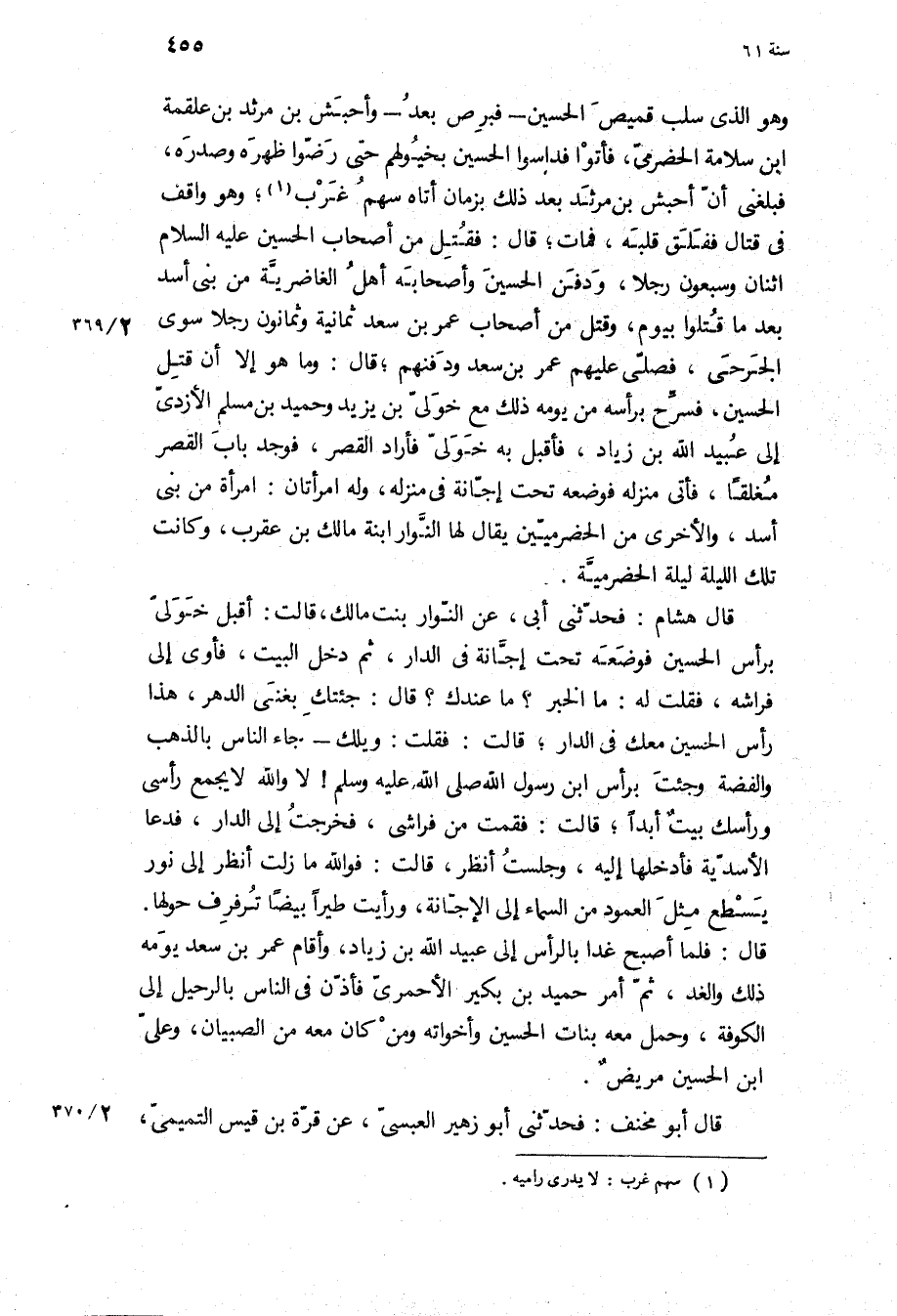 وَهُوَ الَّذِي سلب قميص الْحُسَيْن- فبرص بعد- واحبش بن مرثد بن علقمه ابن سلامة الحضرمي، فأتوا فداسوا الْحُسَيْن بخيولهم حَتَّى رضوا ظهره وصدره، فبلغني أن أحبش بن مرثد بعد ذَلِكَ بزمان أتاه سهم غرب، وَهُوَ واقف فِي قتال ففلق قلبه، فمات، قال: فقتل من اصحاب الحسين ع اثنان وسبعون رجلا، ودفن الْحُسَيْن وأَصْحَابه أهل الغاضرية من بني أسد بعد ما قتلوا بيوم، وقتل من أَصْحَاب عُمَر بن سَعْد ثمانية وثمانون رجلا سوى الجرحى، فصلى عَلَيْهِم عُمَر بن سَعْد ودفنهم، قَالَ: وما هُوَ إلا أن قتل الْحُسَيْن، فسرح برأسه من يومه ذَلِكَ مع خولي بن يَزِيدَ وحميد بن مسلم الأَزْدِيّ إِلَى عُبَيْد اللَّهِ بن زياد، فأقبل بِهِ خولي فأراد القصر، فوجد باب القصر مغلقا، فأتى منزله فوضعه تحت إجانة فِي منزله، وله امرأتان: امرأة من بني أسد، والأخرى من الحضرميين يقال لها النوار ابنة مالك بن عقرب، وكانت تِلَكَ الليلة ليلة الحضرمية قَالَ هِشَام: فَحَدَّثَنِي أبي، عن النوار بنت مالك، قالت: أقبل خولي برأس الْحُسَيْن فوضعه تحت إجانة فِي الدار، ثُمَّ دخل البيت، فأوى إِلَى فراشه، فقلت لَهُ: مَا الخبر؟ مَا عندك؟ قَالَ: جئتك بغنى الدهر، هَذَا رأس الْحُسَيْن معك فِي الدار، قالت: فقلت: ويلك- جَاءَ الناس بالذهب والفضه وجئت برأس ابن رسول الله ص! لا وَاللَّهِ لا يجمع رأسي ورأسك بيت أبدا، قالت: فقمت من فراشي، فخرجت إِلَى الدار، فدعا الأسدية فأدخلها إِلَيْهِ، وجلست أنظر، قالت: فو الله مَا زلت أنظر إِلَى نور يسطع مثل العمود من السماء إِلَى الإجانة، ورأيت طيرا بيضا ترفرف حولها.