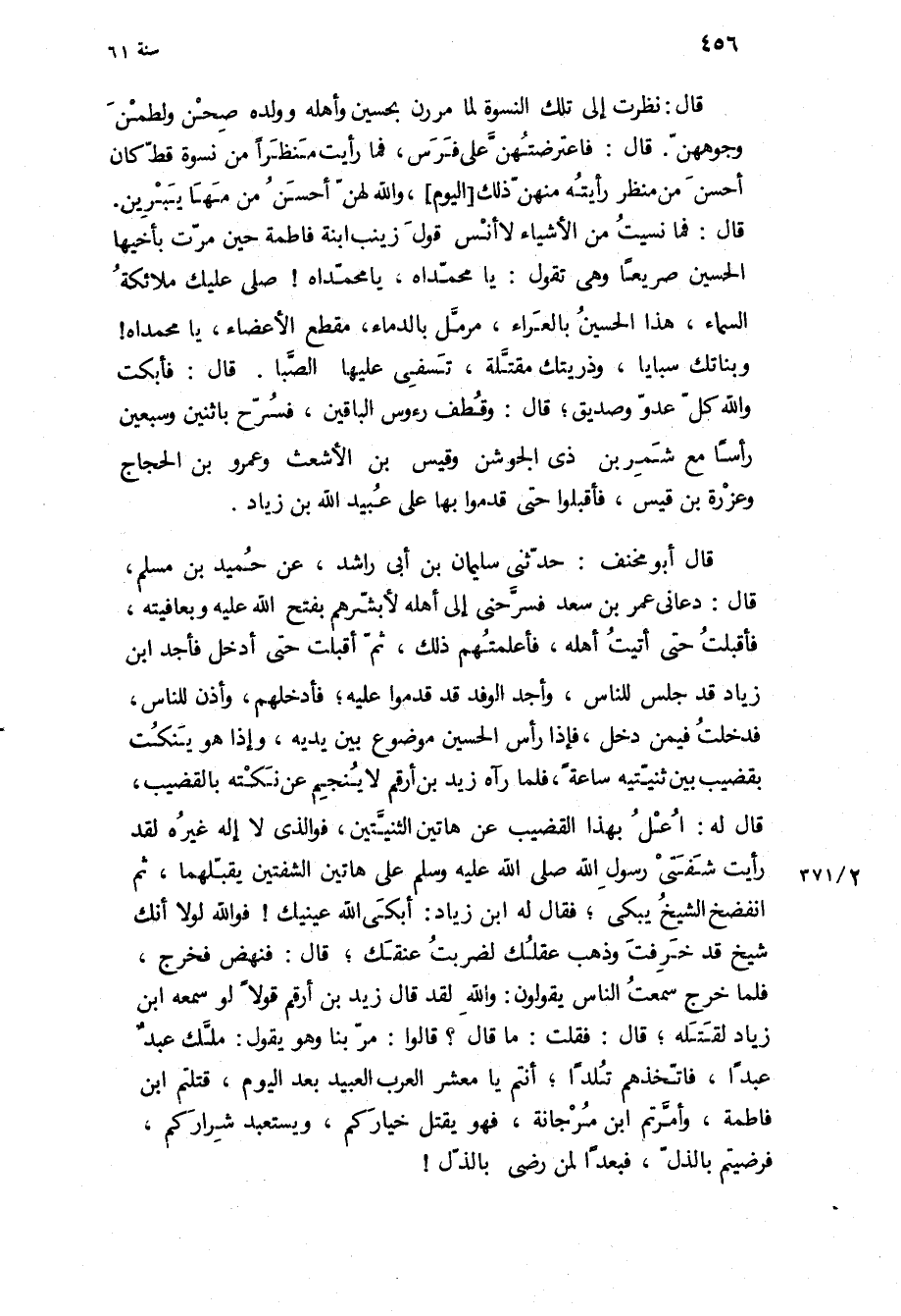 قَالَ أَبُو مخنف: حَدَّثَنِي سُلَيْمَان بن أبي راشد، عن حميد بن مسلم، قَالَ: دعاني عُمَر بن سَعْد فسرحني إِلَى أهله لأبشرهم بفتح اللَّه عَلَيْهِ وبعافيته، فأقبلت حَتَّى أتيت أهله، فأعلمتهم ذَلِكَ، ثُمَّ أقبلت حَتَّى أدخل فأجد ابن زياد قَدْ جلس لِلنَّاسِ، وأجد الوفد قَدْ قدموا عَلَيْهِ، فأدخلهم، وأذن لِلنَّاسِ، فدخلت فيمن دخل، فإذا رأس الْحُسَيْن موضوع بين يديه، وإذا هُوَ ينكت بقضيب بين ثنيتيه ساعة، فلما رآه زَيْد بن أَرْقَمَ: لا ينجم عن نكته بالقضيب، قَالَ لَهُ: اعل بهذا القضيب عن هاتين الثنيتين، فو الذى لا إله غيره لقد رأيت شفتي رَسُول الله ص عَلَى هاتين الشفتين يقبلهما، ثُمَّ انفضخ الشيخ يبكي، فَقَالَ لَهُ ابن زياد: أبكى اللَّه عينيك! فو الله لولا أنك شيخ قَدْ خرفت وذهب عقلك لضربت عنقك، قَالَ: فنهض فخرج، فلما خرج سمعت الناس يقولون: وَاللَّهِ لقد قَالَ زَيْد بن أَرْقَمَ قولا لو سمعه ابن زياد لقتله، قَالَ: فقلت: مَا قَالَ؟ قَالُوا: مر بنا وَهُوَ يقول: ملك عبد عبدا، فاتخذهم تلدا، أنتم يَا معشر العرب العبيد بعد الْيَوْم، قتلتم ابن فاطمة، وأمرتم ابن مرجانة، فهو يقتل خياركم، ويستعبد شراركم، فرضيتم بالذل، فبعدا لمن رضي بالذل!