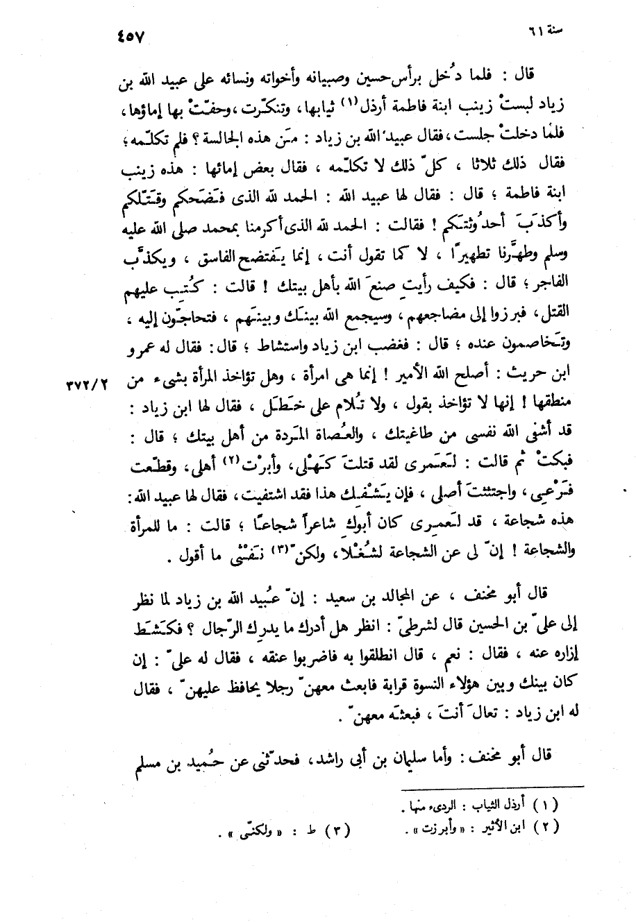 قَالَ أَبُو مخنف، عَنِ الْمُجَالِدِ بن سَعِيد: إن عُبَيْد اللَّهِ بن زياد لما نظر إِلَى عَلِيّ بن الْحُسَيْن قَالَ لشرطي: انظر هل أدرك مَا يدرك الرجال؟ فكشط إزاره عنه، فَقَالَ: نعم، قَالَ انطلقوا بِهِ فاضربوا عنقه، فَقَالَ لَهُ على: إن كَانَ بينك وبين هَؤُلاءِ النسوة قرابة فابعث معهن رجلا يحافظ عليهن، فَقَالَ لَهُ ابن زياد: تعال أنت، فبعثه معهن.