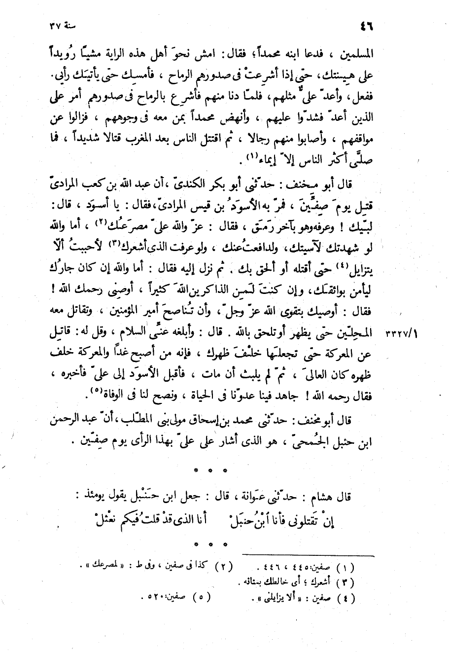 قَالَ أَبُو مخنف: حَدَّثَنِي مُحَمَّدُ بْنُ إِسْحَاق مولى بني المطلب، ان عبد الرحمن ابن حنبل الْجُمَحِيّ، هُوَ الَّذِي أشار عَلَى علي بهذا الرأي يوم صفين.