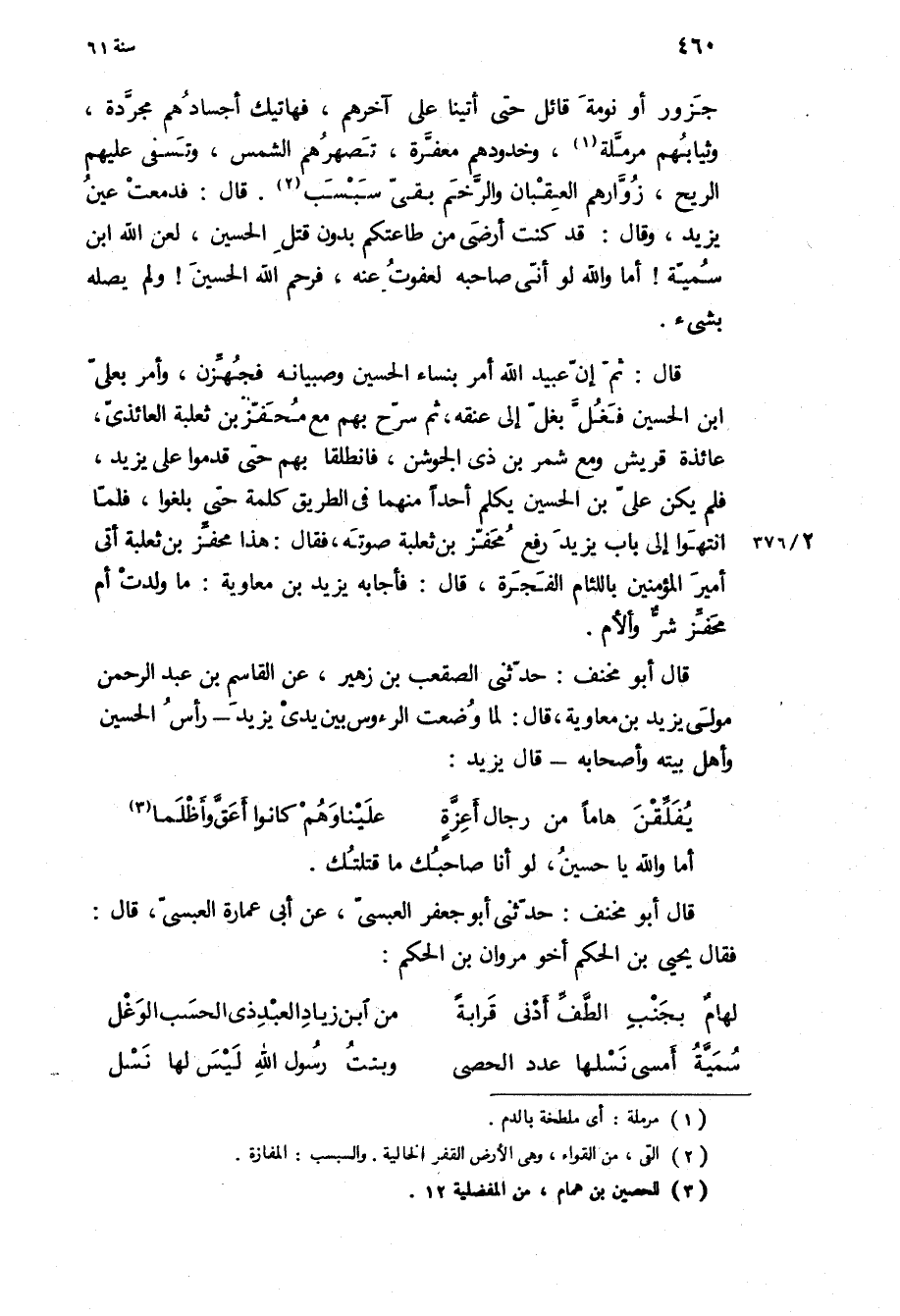 جزور أو نومة قائل حَتَّى أتينا عَلَى آخرهم، فهاتيك أجسادهم مجردة، وثيابهم مرملة، وخدودهم معفرة، تصهرهم الشمس، وتسفى عَلَيْهِم الريح، زوارهم العقبان والرخم بقي سبسب قَالَ: فدمعت عين يَزِيد، وَقَالَ: قَدْ كنت أرضى من طاعتكم بدون قتل الْحُسَيْن، لعن اللَّه ابن سمية! أما وَاللَّهِ لو أني صاحبه لعفوت عنه، فرحم اللَّه الْحُسَيْن! ولم يصله بشيء.
