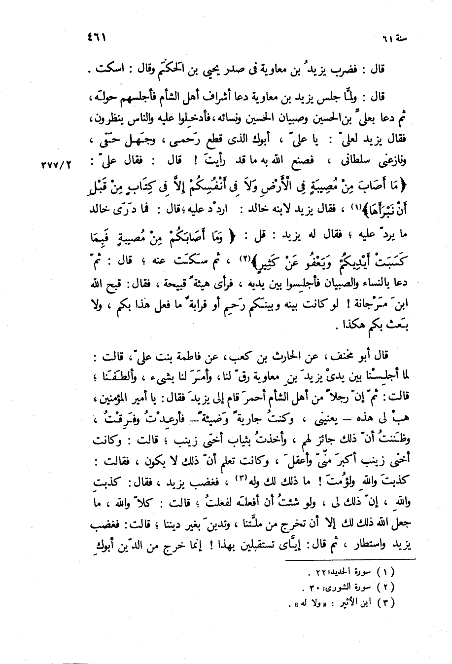 «مَا أَصابَ مِنْ مُصِيبَةٍ فِي الْأَرْضِ وَلا فِي أَنْفُسِكُمْ إِلَّا فِي كِتابٍ مِنْ قَبْلِ أَنْ نَبْرَأَها» ، فَقَالَ يَزِيد لابنه خَالِد: اردد عَلَيْهِ، قَالَ: فما درى خَالِد مَا يرد عَلَيْهِ، فَقَالَ لَهُ يَزِيد: قل: «وَما أَصابَكُمْ مِنْ مُصِيبَةٍ فَبِما كَسَبَتْ أَيْدِيكُمْ وَيَعْفُوا عَنْ كَثِيرٍ» ، ثُمَّ سكت عنه،] قَالَ: ثُمَّ دعا بالنساء والصبيان فأجلسوا بين يديه، فرأى هيئة قبيحة، فَقَالَ: قبح اللَّه ابن مرجانة! لو كَانَتْ بينه وبينكم رحم أو قرابة مَا فعل هَذَا بكم، وَلا بعث بكم هكذا.