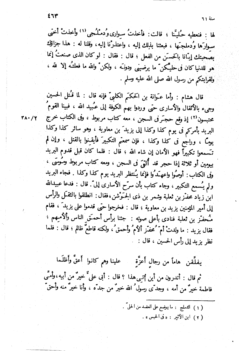 لها: فنعطيه حلينا، قالت: فأخذت سواري ودملجي وأخذت أختي سوارها ودملجها، فبعثنا بِذَلِكَ إِلَيْهِ، واعتذرنا إِلَيْهِ، وقلنا لَهُ: هَذَا جزاؤك بصحبتك إيانا بالحسن من الفعل، قَالَ: فَقَالَ: لو كَانَ الَّذِي صنعت إنما هُوَ للدنيا كَانَ فِي حليكن مَا يرضيني ودونه، ولكن وَاللَّهِ مَا فعلته إلا لِلَّهِ، ولقرابتكم مِنْ رَسُولِ الله ص قَالَ هِشَام: وأما عوانة بن الحكم الكلبي فإنه قَالَ: لما قتل الْحُسَيْن وجيء بالأثقال والأسارى حَتَّى وردوا بهم الْكُوفَة إِلَى عُبَيْد اللَّهِ، فبينا القوم محتبسون إذ وقع حجر فِي السجن، مَعَهُ كتاب مربوط، وفي الكتاب خرج البريد بأمركم فِي يوم كذا وكذا إِلَى يَزِيد بن مُعَاوِيَة، وَهُوَ سائر كذا وكذا يَوْمًا، وراجع فِي كذا وكذا، فإن سمعتم التكبير فأيقنوا بالقتل، وإن لم تسمعوا تكبيرا فهو الأمان إِنْ شَاءَ اللَّهُ، قَالَ: فلما كَانَ قبل قدوم البريد بيومين أو ثلاثة إذا حجر قَدْ ألقي فِي السجن، وَمَعَهُ كتاب مربوط وموسى، وفي الكتاب: أوصوا واعهدوا فإنما ينتظر البريد يوم كذا وكذا فَجَاءَ البريد ولم يسمع التكبير، وجاء كتاب بأن سرح الأسارى إلي قَالَ: فدعا عُبَيْد الله ابن زياد محفز بن ثعلبة وشمر بن ذي الجوشن، فَقَالَ: انطلقوا بالثقل والرأس إِلَى أَمِير الْمُؤْمِنِينَ يَزِيد بن مُعَاوِيَة، قَالَ: فخرجوا حَتَّى قدموا عَلَى يَزِيد، فقام محفز بن ثعلبة فنادى بأعلى صوته: جئنا برأس أحمق الناس وألأمهم، فَقَالَ يَزِيد: مَا ولدت أم محفز ألأم وأحمق، ولكنه قاطع ظالم، قَالَ: فلما نظر يَزِيد إِلَى رأس الْحُسَيْن، قَالَ: