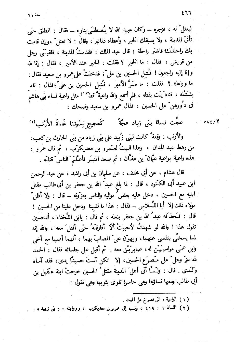 ليعتل لَهُ، فزجره- وَكَانَ عُبَيْد اللَّهِ لا يصطلى بناره- فَقَالَ: انطلق حَتَّى تأتي الْمَدِينَة، وَلا يسبقك الخبر، وأعطاه دنانير، وَقَالَ: لا تعتل، وإن قامت بك راحلتك فاشتر راحلة، قَالَ عَبْد الْمَلِكِ: فقدمت الْمَدِينَة، فلقيني رجل من قريش، فَقَالَ: مَا الخبر؟ فقلت: الخبر عِنْدَ الأمير، فَقَالَ: إِنَّا لِلَّهِ وَإِنَّا إِلَيْهِ راجِعُونَ! قتل الحسين بن على، فدخلت عَلَى عَمْرو بن سَعِيدٍ فَقَالَ: