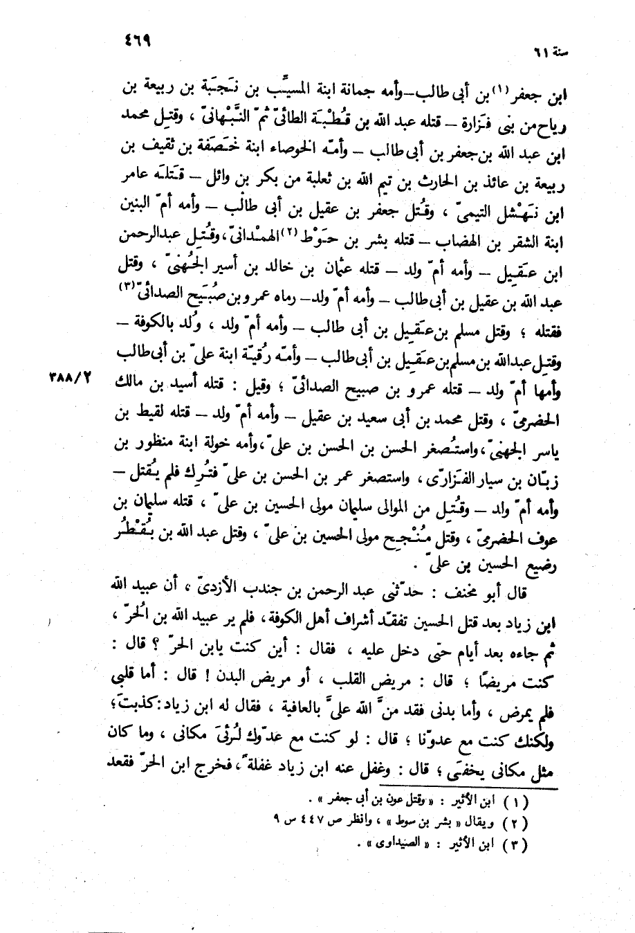 كنت مريضا، قَالَ: مريض القلب، أو مريض البدن! قَالَ: أما قلبي فلم يمرض، وأما بدني فقد من اللَّه علي بالعافية، فَقَالَ لَهُ ابن زياد: كذبت، ولكنك كنت مع عدونا، قَالَ: لو كنت مع عدوك لرئى مكاني، وما كَانَ مثل مكاني يخفى، قَالَ: وغفل عنه ابن زياد غفلة، فخرج ابن الحر فقعد