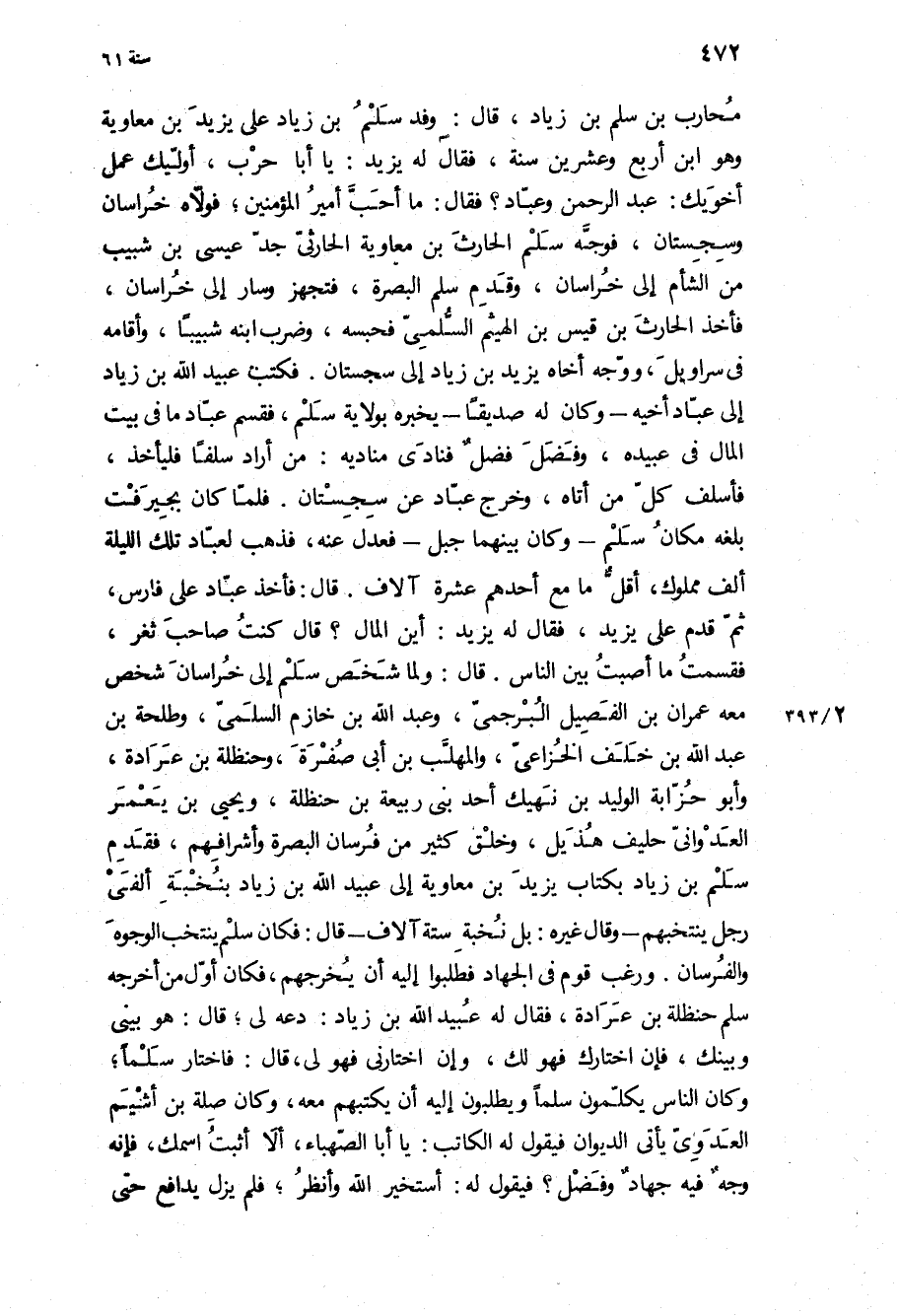 مُحَارِبِ بْنِ سَلْمِ بْنِ زِيَادٍ، قَالَ: وَفَدَ سَلْمُ بْنُ زِيَادٍ عَلَى يَزِيدَ بْنِ مُعَاوِيَةَ وَهُوَ ابْنُ أَرْبَعٍ وَعِشْرِينَ سَنَةً، فَقَالَ لَهُ يَزِيدُ: يَا أَبَا حَرْبٍ، أُوَلِّيكَ عَمَلَ أَخَوَيْكَ: عَبْدِ الرَّحْمَنِ وَعَبَّادٍ؟ فَقَالَ: مَا أَحَبَّ أَمِيرُ الْمُؤْمِنِينَ، فَوَلاهُ خُرَاسَانَ وَسِجِسْتَانَ، فَوَجَّهَ سَلْمٌ الْحَارِثَ بْنَ مُعَاوِيَةَ الْحَارِثِيَّ جَدَّ عِيسَى بْنَ شَبِيبٍ مِنَ الشَّامِ إِلَى خُرَاسَانَ، وقَدِمَ سَلْمٌ الْبَصْرَةَ، فَتَجَهَّزَ وَسَارَ إِلَى خُرَاسَانَ، فَأَخَذَ الْحَارِثَ بْنَ قَيْسِ بْنِ الْهَيْثَمِ السُّلَمِيَّ فَحَبَسَهُ، وَضَرَبَ ابْنَهُ شَبِيبًا، وَأَقَامَهُ فِي سَرَاوِيلَ، وَوَجَّهَ أَخَاهُ يَزِيدَ بْنَ زِيَادٍ إِلَى سِجِسْتَانَ فَكَتَبَ عُبَيْدُ اللَّهِ بْنُ زِيَادٍ إِلَى عَبَّادٍ أَخِيهِ- وَكَانَ لَهُ صَدِيقًا- يُخْبِرُهُ بِوِلايَةِ سَلْمٍ، فَقَسَّمَ عَبَّادٌ مَا فِي بَيْتِ الْمَالِ فِي عَبِيدِهِ، وَفَضَلَ فَضْلٌ فَنَادَى مُنَادِيهِ: مَنْ أَرَادَ سَلَفًا فَلْيَأْخُذْ، فَأَسْلَفَ كُلَّ مَنْ أَتَاهُ، وَخَرَجَ عَبَّادٌ عَنْ سِجِسْتَانَ فَلَمَّا كَانَ بِجِيرُفْتَ بَلَغَهُ مَكَانُ سَلْمٍ- وَكَانَ بَيْنَهُمَا جَبَلٌ- فَعَدَلَ عَنْهُ، فَذَهَبَ لِعَبَّادٍ تِلَكَ اللَّيْلَةِ أَلْفُ مَمْلُوكٍ، أَقَلُّ مَا مَعَ أَحَدِهِمْ عَشَرَةُ آلافٍ قَالَ: فَأَخَذَ عَبَّادٌ عَلَى فَارِسَ، ثُمَّ قَدِمَ عَلَى يَزِيدَ، فَقَالَ لَهُ يَزِيدُ: أَيْنَ الْمَالَ؟ قَالَ كُنْتُ صَاحِبَ ثَغْرٍ، فَقَسَّمْتُ مَا أَصَبْتُ بَيْنَ النَّاسِ قَالَ: وَلَمَّا شَخَصَ سَلْمٌ إِلَى خُرَاسَانَ شَخَصَ مَعَهُ عِمْرَانُ بْنُ الْفَصِيلِ الْبُرْجِمُيُّ، وَعَبْدُ اللَّهِ بْنُ خَازِمٍ السُّلَمِيُّ، وطلحة بن عبد الله بن خلف الخزاعي وَالْمُهَلَّبُ بْنُ أَبِي صُفْرَةَ، وَحَنْظَلَةُ بْنُ عَرَادَةَ، وابو حزابه الْوَلِيدُ بْنُ نَهِيكٍ أَحَدُ بَنِي رَبِيعَةَ بْنِ حَنْظَلَةَ، وَيَحْيَى بْنِ يَعْمُرَ الْعَدَوَانِيُّ حَلِيفُ هُذَيْلٍ، وَخَلْقٌ كَثِيرٌ مِنْ فِرْسَانِ الْبَصْرَةِ وَأَشْرَافِهِمْ، فَقَدِمَ سَلْمُ بْنُ زِيَادٍ بِكِتَابِ يَزِيدَ بْنِ مُعَاوِيَةَ إِلَى عُبَيْدِ اللَّهِ بْنِ زِيَادٍ بِنُخْبَةِ أَلْفَيْ رَجُلٍ يَنْتَخِبُهُمْ- وَقَالَ غَيْرُهُ: بَلْ نُخْبَةُ سِتَّةِ آلافٍ- قَالَ: فَكَانَ سَلْمٌ يَنْتَخِبُ الْوُجُوهَ وَالْفِرْسَانَ وَرَغِبَ قَوْمٌ فِي الْجِهَادِ فَطَلَبُوا إِلَيْهِ أَنْ يُخْرِجَهُمْ، فَكَانَ أَوَّلَ مَنْ أَخْرَجَهُ سَلْمٌ حَنْظَلَةُ بْنُ عَرَادَةَ، فَقَالَ لَهُ عُبَيْدُ اللَّهِ بْنُ زِيَادٍ: دَعْهُ لِي، قَالَ: هُوَ بَيْنِي وَبَيْنَك، فَإِنِ اخْتَارَكَ فَهُوَ لَكَ، وَإِنِ اخْتَارَنِي فَهُوَ لِي، قَالَ: فَاخْتَارَ سَلْمًا، وَكَانَ النَّاسُ يُكَلِّمُونَ سَلْمًا وَيَطْلُبُونَ إِلَيْهِ أَنْ يَكْتُبَهُمْ مَعَهُ، وَكَانَ صِلَةُ بْنُ أَشْيَمَ الْعَدَوِيُّ يَأْتِي الدِّيوَانَ فَيَقُولُ لَهُ الْكَاتِبُ: يَا أَبَا الصَّهْبَاءِ، أَلا أُثْبِتُ اسمك، فانه وجه فيه جهاد وفضل؟ فَيَقُولُ لَهُ: أَسْتَخِيرُ اللَّهَ وَأَنْظُرُ، فَلَمْ يَزَلْ يدافع حتى