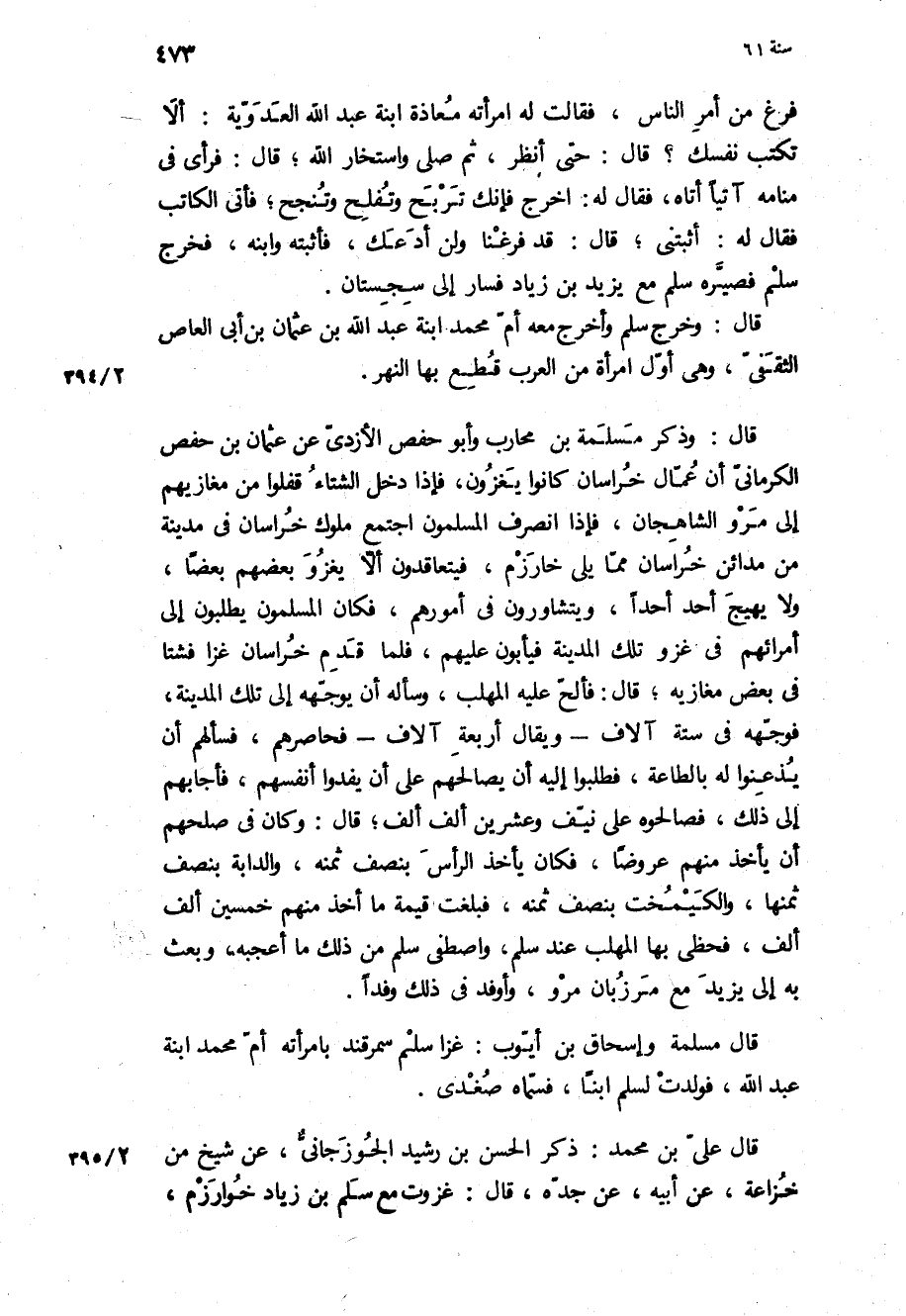 قَالَ: وَذَكَرَ مَسْلَمَةُ بْنُ مُحَارِبٍ وَأَبُو حَفْصٍ الأَزْدِيُّ عَنْ عُثْمَانَ بْنِ حَفْصٍ الْكِرْمَانِيِّ أَنَّ عُمَّالَ خُرَاسَانَ كَانُوا يَغْزُونَ، فَإِذَا دَخَلَ الشِّتَاءُ قَفَلُوا مِنْ مَغَازِيهِمْ إِلَى مَرْوَ الشَّاهِجَانَ، فَإِذَا انْصَرَفَ الْمُسْلِمُونَ اجْتَمَعَ مُلُوكُ خُرَاسَانَ فِي مَدِينَةٍ مِنْ مَدَائِنِ خراسان مما يلى خارزم، فيتعاقدون الا يَغْزُوَ بَعْضُهُمْ بَعْضًا، وَلا يُهَيِّجُ أَحَدٌ أَحَدًا، وَيَتَشَاوَرُونَ فِي أُمُورِهِمْ، فَكَانَ الْمُسْلِمُونَ يَطْلُبُونَ إِلَى أُمَرَائِهِمْ فِي غَزْوِ تِلَكَ الْمَدِينَةِ فَيَأْبَوْنَ عَلَيْهِمْ فَلَمَّا قَدِمَ خُرَاسَانَ غَزَا فَشَتَا فِي بَعْضِ مَغَازِيهِ، قَالَ: فَأَلَحَّ عَلَيْهِ الْمُهَلَّبُ، وَسَأَلَهُ أَنْ يُوَجِّهَهُ إِلَى تِلَكَ الْمَدِينَةِ، فَوَجَّهَهُ فِي سِتَّةِ آلافٍ- وَيُقَالُ أَرْبَعَةِ آلافٍ- فَحَاصَرَهُمْ، فَسَأَلَهُمْ أَنْ يُذْعِنُوا لَهُ بِالطَّاعَةِ، فَطَلَبُوا إِلَيْهِ أَنْ يُصَالِحَهُمْ عَلَى أَنْ يُفْدُوا أَنْفُسَهُمْ، فَأَجَابَهُمْ إِلَى ذَلِكَ، فَصَالَحُوهُ عَلَى نَيِّفٍ وَعِشْرِينَ أَلْفَ أَلْفٍ، قَالَ: وَكَانَ فِي صُلْحِهِمْ أَنْ يَأْخُذَ مِنْهُمْ عُرُوضًا، فَكَانَ يَأْخُذُ الرَّأْسَ بِنِصْفِ ثَمَنِهِ، وَالدَّابَةَ بِنِصْفِ ثَمَنِهَا، وَالْكَيْمَخْتَ بِنِصْفِ ثَمَنِهِ، فَبَلَغَتْ قِيمَةُ مَا أَخَذَ مِنْهُمْ خَمْسِينَ أَلْفَ أَلْفٍ، فَحَظِيَ بِهَا الْمُهَلَّبُ عِنْدَ سَلْمٍ، وَاصْطَفَى سَلْمٌ مِنْ ذَلِكَ مَا أَعْجَبَهُ، وَبَعَثَ بِهِ إِلَى يَزِيدَ مَعَ مَرْزُبَانَ مَرْوَ، وَأَوْفَدَ فِي ذَلِكَ وَفْدًا.