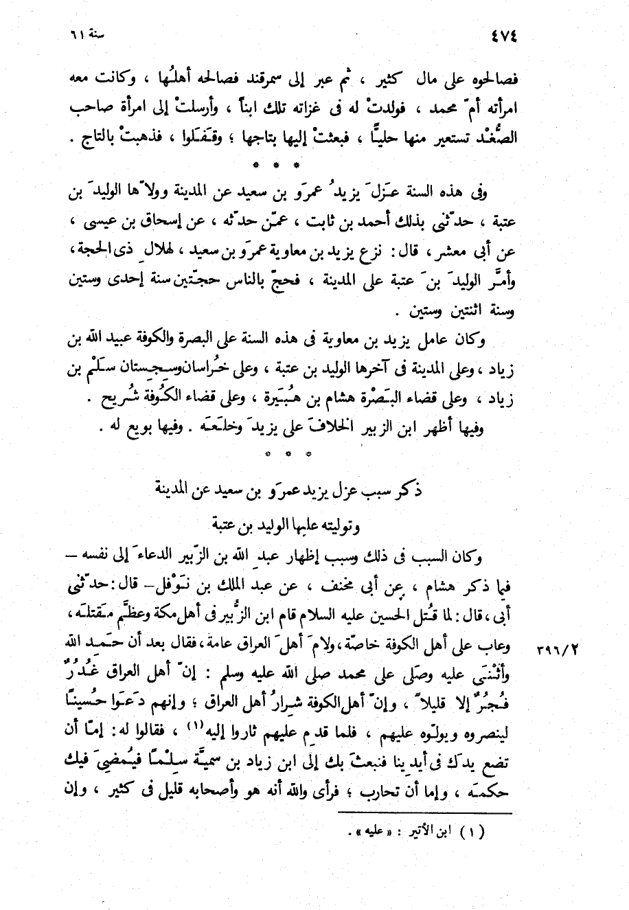 وَفِي هَذِهِ السَّنَةِ عَزَلَ يَزِيدُ عَمْرَو بْنَ سَعِيدٍ عَنِ الْمَدِينَةِ وَوَلاهَا الْوَلِيدَ بْنَ عُتْبَةَ، حَدَّثَنِي بِذَلِكَ أَحْمَد بن ثَابِت، عمن حدثه، عن إسحاق بْن عيسى، عن أبي معشر، قَالَ: نزع يَزِيد بن مُعَاوِيَة عَمْرو بن سَعِيد، لهلال ذي الحجة، وأمر الْوَلِيد بن عتبة عَلَى الْمَدِينَة، فحج بِالنَّاسِ حجتين سنة إحدى وستين.