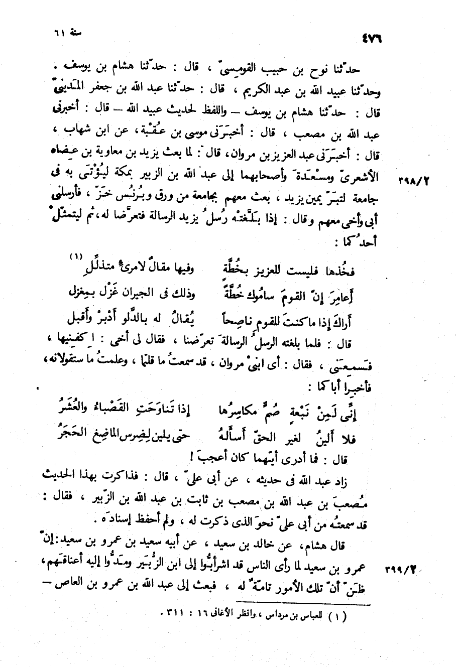حَدَّثَنَا نُوحُ بْنُ حَبِيبٍ الْقُومِسِيُّ، قَالَ: حَدَّثَنَا هِشَامُ بْنُ يُوسُفَ، وَحَدَّثَنَا عُبَيْدُ اللَّهِ بْنُ عَبْدِ الْكَرِيمِ، قَالَ: حَدَّثَنَا عَبْدُ اللَّهِ بْنُ جَعْفَرٍ الْمَدِينِيُّ قَالَ: حَدَّثَنَا هِشَامُ بْنُ يُوسُفَ- وَاللَّفْظُ لِحَدِيثِ عُبَيْدِ اللَّهِ- قَالَ: أَخْبَرَنِي عَبْدُ اللَّهِ بْنُ مُصْعَبٍ، قَالَ: أَخْبَرَنِي مُوسَى بْنُ عُقْبَةَ، عَنِ ابْنِ شِهَابٍ، قَالَ: أَخْبَرَنِي عَبْدُ الْعَزِيزِ بْنُ مَرْوَانَ، قَالَ: لَمَّا بَعَثَ يَزِيدُ بن معاويه بن عَضَاهٍ الأَشْعَرِيَّ وَمَسْعَدَةَ وَأَصْحَابَهُمَا إِلَى عَبْدِ اللَّهِ بْنِ الزُّبَيْرِ بِمَكَّةَ لِيُؤْتَى بِهِ فِي جَامِعَةٍ لِتُبَرَّ يَمِينُ يَزِيدَ، بَعَثَ مَعَهُمْ بِجَامِعَةٍ مِنْ وَرَقٍ وَبُرْنُسِ خَزٍّ، فَأَرْسَلَنِي أَبِي وَأَخِي مَعَهُمْ وَقَالَ: إِذَا بَلَّغَتْهُ رُسُلُ يَزِيدَ الرِّسَالَةَ فَتَعَرَّضَا لَهُ، ثُمَّ لِيَتَمَثَّلَ أَحَدُكُمَا: